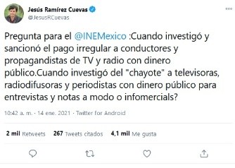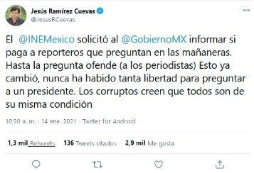 Jesús Ramírez Cuevas, vocero del Presidente Andrés Manuel López Obrador (AMLO), rechazó que la Presidencia de la República pague a reporteros que acuden a las mañaneras para que realicen preguntas a modo.Esto, en respuesta a la solicitud que hizo el Instituto Nacional Electoral (INE) a la vocería de Presidencia acerca de que si los reporteros que preguntaron en la conferencia del pasado 23 de diciembre recibieron algún pago del gobierno federal." "El Instituto Nacional Electoral (INE) solicitó al gobierno federal informar si paga a reporteros que preguntan en las mañaneras. Hasta la pregunta ofende (a los periodistas) Esto ya cambió, nunca ha habido tanta libertad para preguntar a un presidente. Los corruptos creen que todos son de su misma condición".En su cuenta de Twitter, Ramírez Cuevas aseguró que en México nunca ha habido tanta libertad para cuestionar al Mandatario federal.Ramírez Cuevas preguntó al organismo electoral que cuándo investigó y sancionó, indicó, el pago irregular a conductores "y propagandistas" de televisión y radio con dinero público."¿Cuando investigó del "chayote" a televisoras, radiodifusoras y periodistas con dinero público para entrevistas y notas a modo o infomerciales?", escribió.Durante la mañanera de AMLO del 23 de diciembre, un reportero pidió la opinión del sobre la alianza opositora del PAN, PRI y PRD, a lo que el Mandatario respondió que era natural y que esta alianza buscaba mantener los beneficios de una minoría.GC