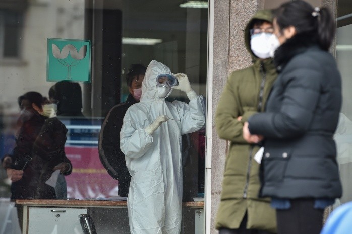 Una enfermera mira un termómetro en el Wuhan Fifth Hospital. AFP/H. Retamal