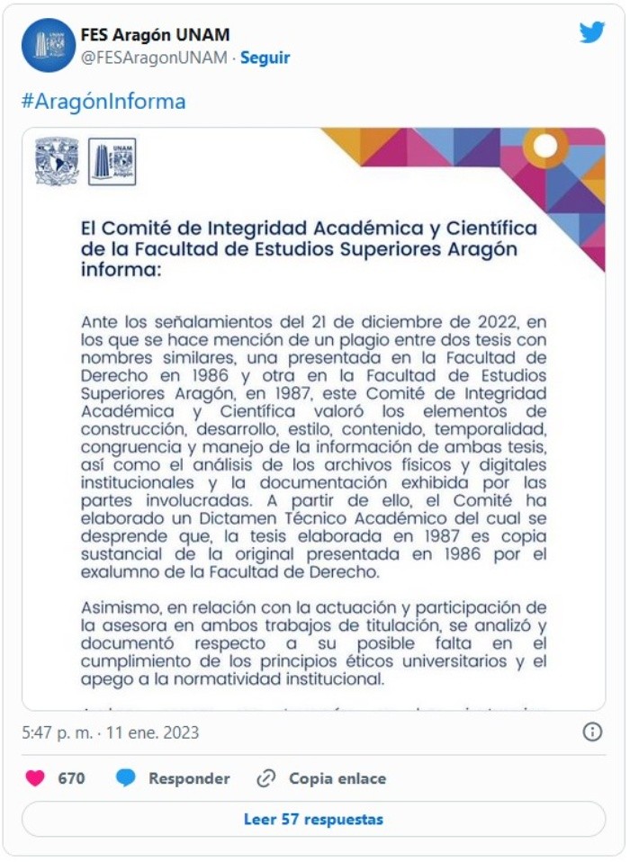 Este miércoles, el Comité de Integridad Académica y Científica de la FES Aragón, de la UNAM, concluyó que la tesis de la ministra Yasmín Esquivel Mossa, presentada en 1987, es un plagio de la de Edgar Ulises Báez Gutiérrez, quien la presentó en 1986.“Este Comité de Integridad Académica y Científica valoró los elementos de construcción, desarrollo, estilo, contenido, temporalidad, congruencia y manejo de la información de ambas tesis, así como el análisis de los archivos físicos y digitales institucionales y la documentación exhibida por las partes involucradas. A partir de ello, el Comité ha elaborado un Dictamen Técnico Académico del cual se desprende que, la tesis elaborada en 1987 es copia sustancial de la original presentada 1986 por el exalumno de la Facultad de Derecho”, aseveró la institución en un comunicado.Añadió que en cuanto a la asesora de ambos trabajos, la maestra Martha Rodríguez, el Comité analizó y documentó su posible falta en el cumplimiento de los principios éticos universitarios y el apego a la normatividad interna, por lo que tanto el caso de la ministra Esquivel Mossa como el de la docente serán turnados a las instancias correspondientes para proceder conforme a la legislación de la UNAM.Desde el pasado 21 de diciembre, la ministra Esquivel Mossa fue señalada por supuestamente plagiar su tesis de licenciatura. Ambos trabajos tienen el mismo título, capitulado, párrafos enteros y hasta conclusiones similares.Ni la ministra ni la Suprema Corte de Justicia de la Nación (SCJN) se han pronunciado sobre esta conclusión de la FES Aragón.JM