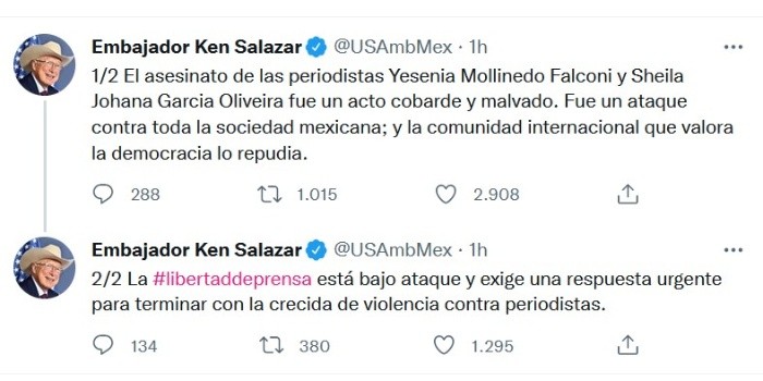 El embajador de Estados Unidos en México, Ken Salazar, condenó el asesinato de dos periodistas en Veracruz, perpetrado este lunes, y que consideró un "ataque contra toda la sociedad mexicana".Mediante un par de mensajes en su cuenta de Twitter, el diplomático estadounidense calificó como un acto "cobarde y malvado" el homicidio de Yesenia Mollinedo y Sheila Johana García, directora y camarógrafa, respectivamente, del medio digital El Veraz."Fue un ataque contra toda la sociedad mexicana; y la comunidad internacional que valora la democracia lo repudia", agregó.Ante estos asesinatos, con los que suman 11 durante 2022, el embajador Salazar pidió "una respuesta urgente"."La #libertaddeprensa está bajo ataque y exige una respuesta urgente para terminar con la crecida de violencia contra periodistas", escribió.De acuerdo con testigos, el ataque contra Yesenia Mollinedo y Sheila Johana García ocurrió este lunes mientras ambas periodistas viajaban en un auto compacto.El ataque, según la información, se efectuó cuando se encontraban en el estacionamiento de una tienda de conveniencia.Por los impactos de bala, Yesenia Mollinedo fue trasladada a un hospital de la localidad, donde finalmente falleció.JM