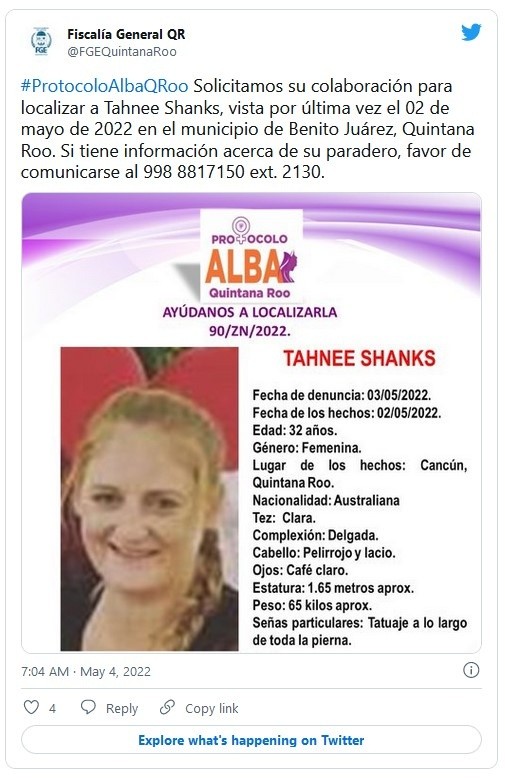 Una mujer australiana desapareció el pasado fin de semana cuando llegó a visitar el puerto de El Cuyo y Las Coloradas, por lo que se ha levantado el Protocolo Alba en Quintana Roo y Yucatán para encontrarla. Extrañamente, la hija de la mujer apareció sola en Cancún.Se trata de Tahnee Shanks, quien llegó el pasado sábado 30 de abril a Yucatán junto con su hija de dos años y su pareja, Jorge Luis Aguirre, para visitar los puertos tizimileños de El Cuyo y Las Coloradas. Sin embargo, a partir de esa fecha ya no tuvo más contacto con su familia de Australia y hasta ahora se desconoce su paradero.Lo más extraño del caso es que su hija Addie fue encontrada deambulando sola en la calle 107 con 74, en la Supermanzana 220 de Cancún. Presuntamente la menor habría llegado sola a la parroquia San Miguel Arcángel. Un tío fue quien identifico a la menor y dijo a la Policía que Tahnne llegó a la Península de Yucatán para pasar las vacaciones.Ante los hechos la Fiscalía General de Quintana Roo activó el Protocolo Alba para su búsqueda, posteriormente se activaría el Protocolo en Yucatán. Mientras, la pequeña de dos años quedó en resguardo del DIF. Amigos y conocidos sospechan de Jorge Aguirre Estudillo, la pareja de la australiana, quien supuestamente también está desaparecido. De acuerdo con sus dichos, tiene historial de abuso y violencia familiar.Debido al lugar en el que apareció su hija, familiares reportan que la pareja habría sido vista abandonando a la menor cerca de la iglesia y trascendió que Jorge Aguirre manejaba una camioneta tipo pick up.El hermano de la joven Tahnee ofrece una recompensa de cinco mil dólares australianos a quien pueda brindar información que lo lleve a encontrar a su hermana. La joven de 32 años es de tez clara, complexión delgada, cabello pelirrojo y lacio, ojos café claro, mide 1.65 y pesa 65 kilos, tiene un tatuaje a lo largo de la pierna.JM