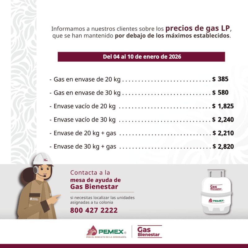 Gas Bienestar fue creado en 2021 con la finalidad de frenar prácticas especulativas en el costo del gas LP, asegurar un suministro confiable y disminuir el impacto de este energético en el gasto de las familias mexicanas.En la actualidad, el programa opera de manera prioritaria en la Ciudad de México y cuenta con el respaldo del Gobierno federal, que busca ofrecer a los hogares una opción accesible y equitativa frente a los precios que maneja el mercado privado.Como parte de su operación habitual, Gas Bienestar dio a conocer las tarifas que estarán vigentesen la semana del 5 al 10 de enero. Los precios se ubican en un rango competitivo respecto a las empresas particulares, con el propósito de garantizar que los hogares de la capital y su zona metropolitana tengan acceso a un servicio confiable y a costos razonables.Estos precios reflejan el compromiso de mantener un energético básico a tarifas accesibles, en cumplimiento con los límites fijados por la Comisión Nacional de Energía.Los costos se mantienen dentro de los topes autorizados por las autoridades regulatorias como parte del programa Gas Bienestar, que busca ofrecer un servicio seguro y confiable, con cilindros verificados y sellos de garantía que aseguran el llenado completo del producto.Solicitar el suministro de Gas Bienestar es un proceso sencillo y accesible. A través de su cuenta de X, este programa informó que la única manera de solicitar la venta de cilindros es por pedido.La empresa, que opera con camiones equipados con tecnología avanzada para garantizar seguridad y localización, invita a los consumidores a contactar al centro de ayuda al número 800 427 2222 para cualquier consulta o servicio. YC