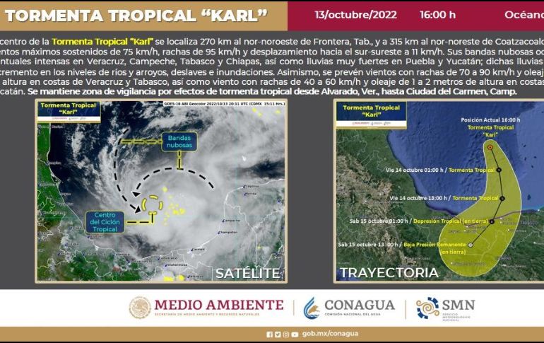 La tormenta tropical "Karl" se encontraba a las 16:00 horas a 270 kilómetros al nor-noreste de Frontera, Tabasco, y a 315 km al nor-noreste de Coatzacoalcos, Veracruz, con vientos máximos sostenidos de 75 kilómetros por hora, informó la Comisión Nacional del Agua (COnagua).La dependencia detalló en un comunicado que tiene rachas de 95 km/h y desplazamiento al sur-sureste a 11 km/h.Sus bandas nubosas, señaló, ocasionarán lluvias intensas (de 75 a 150 milímetros) en Campeche, Chiapas, Tabasco y Veracruz, así como muy fuertes (de 50 a 75 mm) en Puebla y Yucatán."Persistirá el pronóstico de vientos de 70 a 90 (m/h y oleaje de 2 a 3 metros (m) de altura en costas de Tabasco y Veracruz, y rachas de 40 a 60 km/h con olas de 1 a 2 m en el litoral de Campeche y Yucatán", añadió.En el documento se detalló que el Servicio Meteorológico Nacional (SMN), de la Comisión Nacional del Agua (Conagua), en coordinación con el Centro Nacional de Huracanes de Miami, Estados Unidos de América mantienen zona de vigilancia por efectos de tormenta tropical, desde Alvarado, Veracruz, hasta Ciudad del Carmen, Campeche."Las lluvias generadas por este sistema podrían provocar deslaves, incremento en niveles de ríos y arroyos, desbordamientos e inundaciones en zonas de los estados mencionados".Por lo anterior, las autoridades exhortan a la población y a la navegación marítima atender los avisos del SMN y seguir las indicaciones de las autoridades estatales, municipales y de Protección Civil."A la navegación marítima en las inmediaciones del sistema se la hace un llamado a extremar precauciones por condiciones de vientos fuertes y oleaje en zonas costeras".