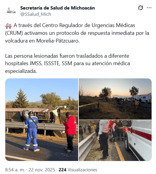 Este sábado 22 de noviembre se registró un trágico accidente de autobús en el estado de Michoacán. Las autoridades locales han informado que, como consecuencia del siniestro, al menos 10 personas perdieron la vida y otras 20 resultaron heridas.El siniestro ocurrió en la carretera que une Morelia, capital de Michoacán, con el poblado de Pátzcuaro, según informó la policía del primer municipio a través de un comunicado oficial."Se informa que hay alrededor de 10 personas sin vida y cerca de 20 personas lesionadas, por lo que se realizan labores de extracción atención médica en el lugar", dijo la corporación en sus redes sociales oficiales.Añadió que la circulación en la vía permanece cerrada, y se mantendrá así mientras los cuerpos de rescate continúan con sus labores en el lugar.Hasta el momento, las autoridades no han especificado la causa exacta del accidente ni han brindado detalles sobre las circunstancias que lo rodearon.La Secretaría de Salud de Michoacán, a través de su cuenta oficial en la plataforma X (@SSalud_Mich), publicó que a través del Centro Regulador de Urgencias Médicas (CRUM) "activamos un protocolo de respuesta inmediata por la volcadura en Morelia-Pátzcuaro".Informó que las persona lesionadas fueron trasladados a diferentes hospitales del IMSS, ISSSTE, SSM para su atención médica especializada.De acuerdo con información de medios nacionales, el grupo de personas viajaba del municipio de Uruapan a Tlalpujahua, cuando el autobús turístico en el que se trasladaban volcó sobre la carretera y terminó de costado.En México se suelen registrar accidentes en las carreteras, ya sea por exceso de velocidad o falta de mantenimiento en los vehículos, principalmente autobuses o camiones de carga.En septiembre, un camión cargado con casi 50 mil litros de gasolina se quedó en un cruce de Ciudad de México, lo que provocó 32 muertos. Este trágico incidente resalta la seriedad de los percances viales en el país y las graves consecuencias que pueden derivarse de ellos.*Con información de AFP*Mantente al día con las noticias, únete a nuestro canal de WhatsAppOF