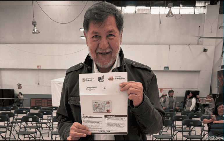 En la imagen, Noroña posa junto con su tarjeta del Banco del Bienestar, a través de la cual, como todo derechohabiente, recibirá un pago bimestral de 6 mil 200 pesos.