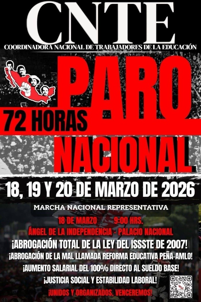 La Coordinadora Nacional de Trabajadores de la Educación (CNTE) ha anunciado un paro nacional de 72 horas para exigir la abrogación total de la Ley del ISSSTE de 2007, la eliminación de la reforma educativa y un aumento salarial del 100%, lo que dejará sin clases a muchos alumnos en México del miércoles 18 al viernes 20 de marzo.