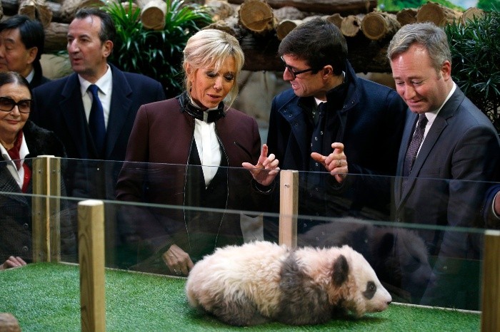 La primera dama de Francia, Brigitte Macron, participó este lunes en la ceremonia oficial en la que se bautizó al primer panda nacido en Francia, fruto de una pareja de osos prestada por Beijing como un gesto de amistad diplomática.Este préstamo realizado en 2012 por una duración de 10 años forma parte de la llamada "diplomacia del panda", con la que China busca promocionar su amistad con otros países.Para bautizar a este "tesoro nacional chino" se organizó una ceremonia en el zoológico de Beauval en presencia de Brigitte Macron --quien fue nombrada madrina del cachorro--, del viceministro chino de Relaciones Exteriores Zhan Yesui y del embajador de China en Francia Zhai Ju. El pequeño de siete kilos, cuyo gemelo falleció poco después de nacer en agosto, fue bautizado Yuan Meng, que significa "un sueño hecho realidad" en chino.En tres años, Yuan Meng deberá regresar a China, pero "esperamos que sus padres (...) nos den muchos más bebés", declaró Delphine Pouvreau, quien cuida del pequeño en el zoológico.Visiblemente sorprendido por las cámaras y la nutrida delegación, el pequeño panda, que se encontraba en una plataforma rodeada de vidrio, emitió fuertes gruñidos cuando su madrina trató de acariciarlo.Este fue uno de los primeros actos oficiales de Brigitte Macron, de 64 años, desde que su esposo, Emmanuel Macron, de 39, asumiera la presidencia de Francia en mayo.En su discurso, la primera dama dijo que Francia está "orgullosa y feliz" de acoger en su suelo a la pareja de pandas de China y que su cachorro es un símbolo de las relaciones históricas entre ambos países."A través de él, tenemos la responsabilidad de trabajar en la construcción de la amistad franco-china", dijo Brigitte Macron en un mensaje dirigido a su homóloga china y "comadrina" Peng Liyuan, quien estuvo ausente.La reproducción de pandas gigantes, un mamífero en peligro de extinción, es un proceso delicado. El año pasado en Europa nacieron apenas tres ejemplares de esta especie. DR