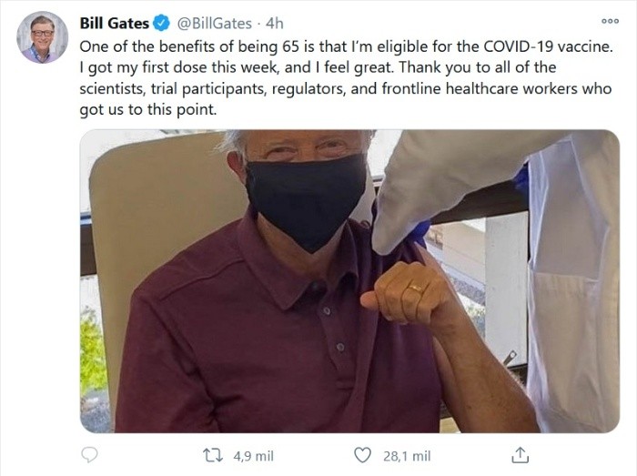 Uno de los personajes que ha tenido mucho que decir respecto al nuevo coronavirus es Bill Gates. El cofundador de Microsoft advirtió en 2015 sobre una crisis sanitaria como la que estamos viviendo y, desde que se declaró la pandemia el año pasado, ha destinado millones de dólares a la investigación de la enfermedad y el desarrollo de una vacuna. Y ahora ha dado a conocer que se ha puesto la primera dosis para protegerse del virus.A través de su cuenta de Twitter, el empresario y filántropo compartió una imagen en la que se le puede ver usando cubrebocas y recibiendo la vacuna.El mensaje que acompaña a la imagen dice: "Uno de los beneficios de tener 65 años es que soy elegible para la vacuna COVID-19. Recibí mi primera dosis esta semana y me siento genial. Gracias a todos los científicos, participantes de ensayos, reguladores y trabajadores de la salud de primera línea que nos llevaron a este punto".Por su edad, Gates era elegible para ser de los primeros en recibir vacuna según el nivel 1 de distribución de vacunas del estado de Washington.Además de compartir con sus seguidores el momento, la imagen también es interpretada como un esfuerzo del empresario por generar tranquilidad entre la población e invitar a que más personas confíen no sólo en esta solución sino en la ciencia en general.Y es que, a través de su Fundación Bill y Melinda Gates, el empresario ha destinado cientos de millones de dólares a fondos para iniciativas relacionadas con el COVID-19, incluido el desarrollo y distribución de vacunas. Pero, en el pasado también ha apoyado otras investigaciones para tratar enfermedades como el ébola.JM