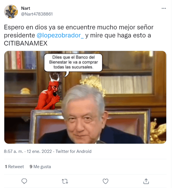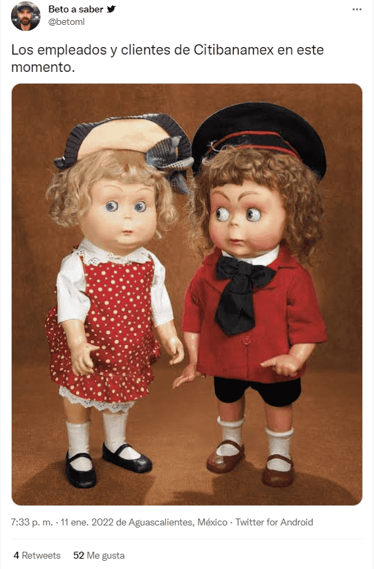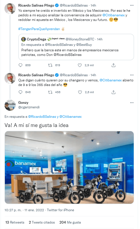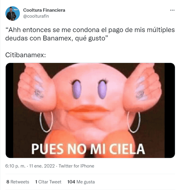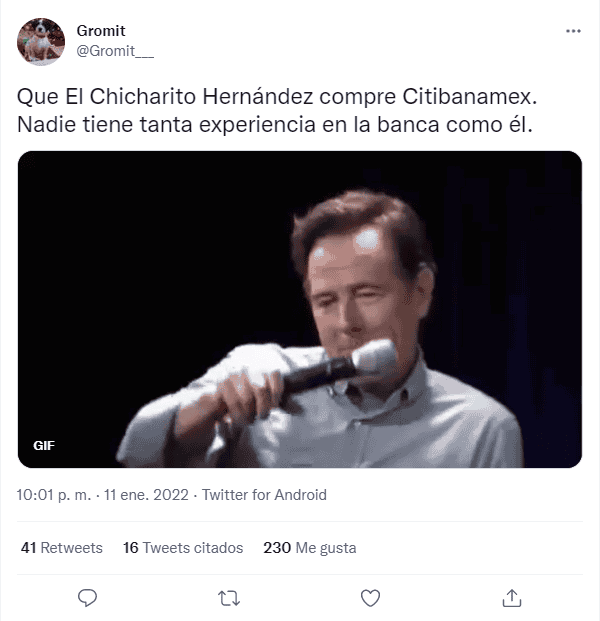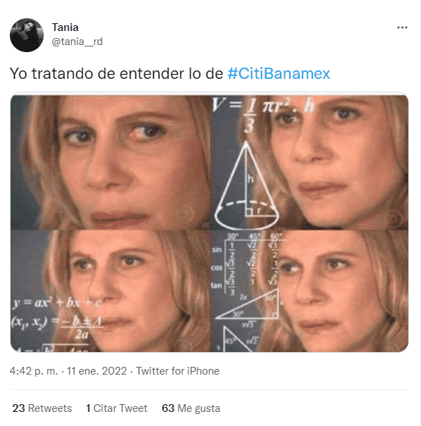 Este martes 11 de enero de 2022 el banco estadounidense Citigroup anunciaba que ponía a la venta su negocio en nuestro país, que incluye la marca Banamex, Afore, Casa de Bolsa, así como cartera de crédito y tarjetas de crédito a empresas, entre otras, según lo dado a conocer por el director corporativo de desarrollo institucional, estudios económicos y comunicación de Citibanamex, Alberto Gómez Alcalá.Junto a la confusión sobre lo que esta transacción implicará para clientes de Citibanamex con relación a sus productos o servicios contratados, las redes sociales poco tardaron en llenarse de memes al respecto, desde aquellos sobre el trabajo finalmente terminado de quienes instalan señalética del banco hasta algunos haciendo alusión a la posibilidad de que Ricardo Salinas Pliego compre Banamex.A continuación te compartimos algunos de los memes que circularon desde este martes en Internet con relación a dicho anuncio sobre Citibanamex, cuyos clientes y empleados podrán quedarse tranquilos, a decir de Gómez Alcalá quien asegura que la manera en que operan las sucursales y cartera de servicios se mantiene sin cambios: