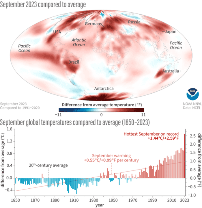 Este pasado mes de septiembre es considerado como el más cálido en los 174 años que registra la Oficina Nacional de Administración Oceánica y Atmosférica (NOAA).La temperatura de la superficie global de enero a septiembre de 2023, fue el periodo más cálido jamás registrado. Según la Perspectiva anual global de temperatura del NCEI y los datos hasta septiembre, existe una probabilidad superior al 99% de que 2023 sea el año más cálido jamás registrado."Septiembre de 2023 fue el cuarto mes consecutivo de temperaturas globales récord", dijo la científica jefe de la NOAA, Dra. Sarah Kapnick. "No solo fue el septiembre más cálido jamás registrado, sino que fue de lejos el mes más atípicamente cálido de todos los tiempos" . "En los 174 años de mantenimiento del clima de la NOAA. Para decirlo de otra manera, septiembre de 2023 fue más cálido que el julio promedio de 2001-2010", detalló.De acuerdo con el portal de Ciencia e Información para una nación climáticamente inteligente de la NOAA, la temperatura superficial global de septiembre fue 2,59°F (1,44°C) por encima del promedio del siglo XX de 59,0°F (15,0°C) y se ubica como el septiembre más cálido en el registro de 174 años de la NOAA. Esto fue 0,83 °F (0,46 °C) por encima del récord anterior de septiembre de 2020 y marca la anomalía de temperatura global mensual más alta de cualquier mes registrado. La anomalía de la temperatura global de septiembre de 2023 superó la anomalía mensual récord anterior de marzo de 2016 en 0,16 °F (0,09 °C). América del Norte, América del Sur, Europa y África tuvieron el septiembre más cálido jamás registrado. *Mantente al día con las noticias, únete a nuestro canal de WhatsApp aquí: https://whatsapp.com/channel/0029VaAf9Pu9hXF1EJ561i03MV