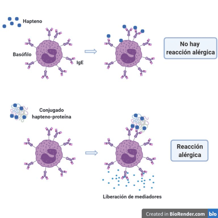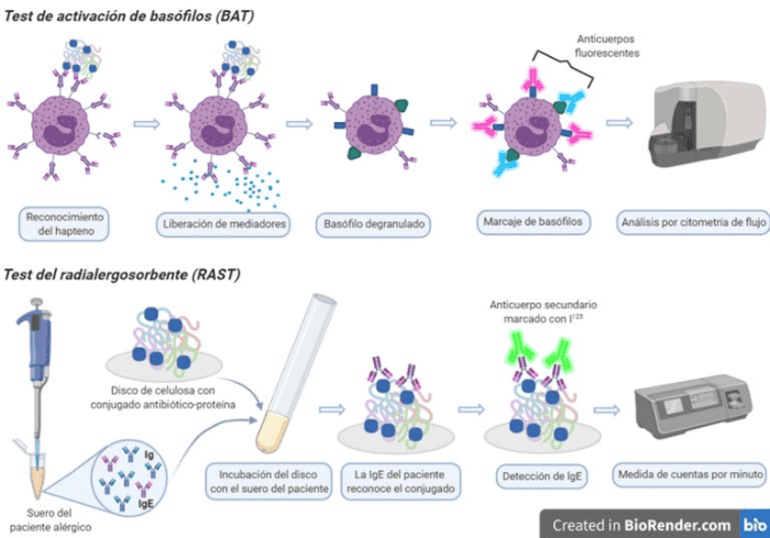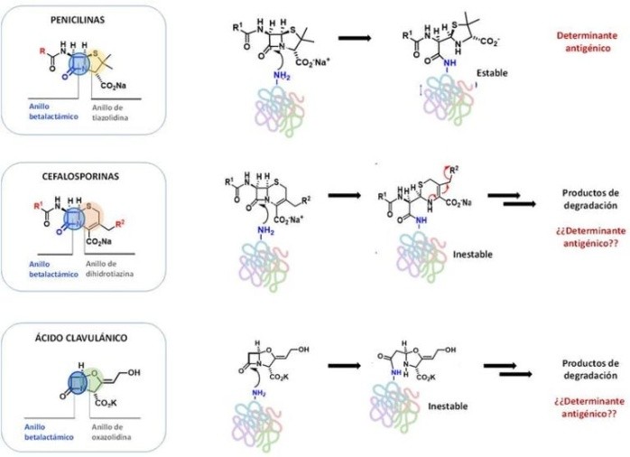 Quizá la primera idea antes de ir al médico sea pensar que se trata de una alergia.Sin embargo, debemos ser muy cautelosos: en realidad solo entre un 6 y un 10% de los casos sospechosos son confirmados como una reacción alérgica al medicamento.Las reacciones alérgicas son solo aquellas que se producen por un mecanismo inmunológico bien definido.En el resto de los casos, puede tratarse de otras reacciones adversas como un efecto secundario o una intolerancia.Los antibióticos betalactámicos, como las penicilinas y cefalosporinas, son el segundo tipo de medicamento más consumido en España.Estos son los responsables de la mayoría de las reacciones alérgicas a medicamentos.La respuesta es clara: por la salud del paciente, que podrá saber si de verdad debe evitar ese antibiótico o puede tomarlo cuando lo necesite.Si ante una sospecha de alergia, esta no se confirma y se evita el medicamento, la mayoría lo haría sin necesidad.Además, la prescripción de antibióticos alternativos, normalmente más caros y menos seguros, eleva el coste sanitario y puede contribuir a la aparición de resistencias.Las reacciones alérgicas a los antibióticos también se conocen como reacciones de hipersensibilidad.Son una respuesta anormal que se produce por la interacción entre el antibiótico y nuestro sistema inmune.El mecanismo más aceptado para explicar la alergia a antibióticos betalactámicos es la "hipótesis del hapteno".Estos fármacos actúan como haptenos, sustancias de bajo peso molecular que no pueden inducir una respuesta inmune por sí solas, solo tras unirse a proteínas.Una porción de la estructura formada tras la unión antibiótico-proteína puede ser ahora reconocida por los componentes del sistema inmune.Esa porción se denomina "determinante antigénico" o "epítopo" y está formada por una parte de la proteína unida a una estructura derivada del fármaco original.Las reacciones alérgicas inmediatas a betalactámicos son las que aparecen dentro de la primera hora tras tomar el antibiótico.El desarrollo de este tipo de reacciones se da en dos etapas.La primera, la etapa de sensibilización, se produce las primeras veces que estamos en contacto con el antígeno (conjugado antibiótico-proteína).Se generan anticuerpos tipo IgE específicos que se unen a la superficie de células llamadas mastocitos y basófilos.En la segunda, la etapa efectora, el antígeno se une a al menos dos IgE cercanas y esto conlleva la liberación de moléculas que favorecen la inflamación. Aparecen entonces los síntomas de la alergia.Las pruebas in vitro se realizan en el laboratorio, utilizando una pequeña cantidad de sangre o suero del paciente.El test de activación de basófilos (BAT) detecta la presencia de IgE en la superficie de basófilos.En los últimos años, el BAT está ganando fuerza para el diagnóstico de alergia a antibióticos, sin embargo, debe utilizarse en combinación con pruebas in vivo para conseguir una buena sensibilidad (capacidad para detectar los casos alérgicos).Por otro lado, los inmunoensayos se basan en la detección de IgE en suero.Actualmente, la prueba del radioalergosorbente (RAST) es prácticamente el único método in vitro con la sensibilidad adecuada para detectar la extremadamente pequeña cantidad de IgE presente en casos de alergia a antibióticos.El suero del paciente se incuba con discos de celulosa que contienen el conjugado antibiótico-proteína implicado en la alergia.Posteriormente, la IgE del paciente que reconoce el determinante antigénico, se detecta utilizando un anticuerpo secundario marcado con radiactividad.A pesar de su sensibilidad, algunos inconvenientes del RAST son que se trata de un método casero no automatizado, y el empleo de radiactividad.Además, no se puede utilizar para betalactámicos como el ácido clavulánico.Las pruebas in vitro se realizan en el laboratorio, utilizando una pequeña cantidad de sangre o suero del paciente.El test de activación de basófilos (BAT) detecta la presencia de IgE en la superficie de basófilos.En los últimos años, el BAT está ganando fuerza para el diagnóstico de alergia a antibióticos, sin embargo, debe utilizarse en combinación con pruebas in vivo para conseguir una buena sensibilidad (capacidad para detectar los casos alérgicos).Por otro lado, los inmunoensayos se basan en la detección de IgE en suero.Actualmente, la prueba del radioalergosorbente (RAST) es prácticamente el único método in vitro con la sensibilidad adecuada para detectar la extremadamente pequeña cantidad de IgE presente en casos de alergia a antibióticos.El suero del paciente se incuba con discos de celulosa que contienen el conjugado antibiótico-proteína implicado en la alergia.Posteriormente, la IgE del paciente que reconoce el determinante antigénico, se detecta utilizando un anticuerpo secundario marcado con radiactividad.A pesar de su sensibilidad, algunos inconvenientes del RAST son que se trata de un método casero no automatizado, y el empleo de radiactividad.Además, no se puede utilizar para betalactámicos como el ácido clavulánico.La falta de sensibilidad de los inmunoensayos es debida a que el conjugado antibiótico-proteína usado no corresponde con el que se forma in vivo.De esta forma, las IgE de los pacientes no lo reconocen y no se puede detectar su presencia en suero.Por tanto, conocer la estructura derivada del antibiótico que forma parte del determinante antigénico es de vital importancia para avanzar en el desarrollo de pruebas in vitro eficaces.La química es de gran ayuda para la identificación y caracterización de los determinantes antigénicos de antibióticos betalactámicos.Los grupos amino de las lisinas presentes en las proteínas reaccionan con el grupo carbonilo del anillo betalactámico, que se abre.En el caso de las penicilinas como amoxicilina y bencilpenicilina, esta estructura abierta unida a la proteína es estable y se sabe que está implicada en la alergi
