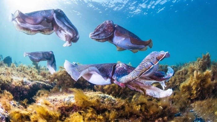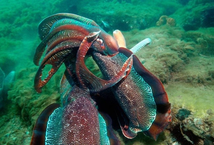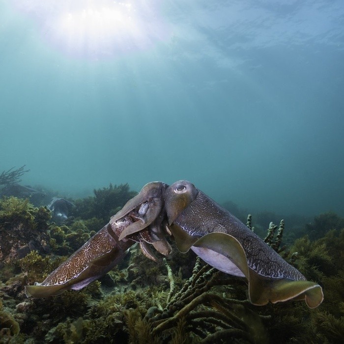 "La primera vez que vas y metes la cabeza bajo el agua y ves cientos y cientos de sepias en esa pequeño área, parece un caleidoscopio caótico", cuenta Bramley.Como propietario de Whyalla Diving Services y defensor durante décadas de la sepia gigante australiana, Bramley ha observado durante años el apareamiento frenético y colorido de las sepias que se produce en el Parque Marino del Norte del Golfo Spencer, en el sur de Australia.Solía ser sólo de interés para los pescadores y los buceadores locales, que corrían la voz unos a otros avisando que "llegaron las sepias".Ahora, ese fenómeno marino atrae a turistas e investigadores de todo el mundo a la pequeña ciudad siderúrgica de Whyalla, en la península de Eyre, en el sur de Australia.La Sepia apama, un tipo de invertebrado marino estrechamente relacionado con el pulpo, es un molusco inteligente que puede cambiar de color y textura al instante.Se sabe que resuelven acertijos y pueden hipnotizar a sus presas convirtiendo su cuerpo en luces estroboscópicas, que emiten rápidamente colores a través de su piel para distraer y aturdir a un cangrejo o pez desprevenido.Sus habilidades de camuflaje avergüenzan a los camaleones y hasta han atraído la atención del Ejército de Estados Unidos, que ha investigado las habilidades de cambio de color de las sepias con la idea de replicar sus técnicas para uso militar.Si eso no es lo suficientemente inusual, sus comportamientos de apareamiento son extraños, por decir lo menos.De mayo a septiembre de cada año, cientos de miles de sepias gigantes australianas se reúnen en las aguas cercanas a Point Lowly, en la parte más septentrional del golfo de Spencer, con el único propósito de aparearse.Es entonces cuando Whyalla se convierte en el escenario del show de sexo submarino más extravagante y uno de los eventos más espectaculares de la naturaleza: el desove de la sepia gigante australiana.Las sepias más grandes del mundo se encuentran en las aguas del sur de Australia, pero solo en Whyalla se reúnen en grandes cantidades para aparearse."Una estimación del número de sepias que se concentraron en 2020 fue de 247.000, el más alto registrado", dijo el profesor Bronwyn M. Gillanders, un destacado investigador de sepias y director de la Facultad de Ciencias Biológicas de la Universidad de Adelaida."Ese es el número reportado, pero sabemos que es probable que sea una subestimación".Según Gillanders, Whyalla atrae a las sepias debido a su paisaje marino único.La sección más norteña del golfo de Spencer ofrece muchos salientes rocosos que las hembras usan para poner sus huevos. Y, aunque las sepias se aparean en otros lugares, es aquí donde más lo hacen de todo el planeta.No hay ningún otro lugar en el mundo donde se puedan observar comportamientos de apareamiento tan espectaculares y extraños en masa, incluidos cambios de color y machos que se disfrazan de hembras.Nadie dijo que encontrar pareja fuera fácil —y estas sepias están solteros/as y sin compromiso—, pero lo primero que tienen que hacer es llegar a la fiesta.Bramley explicó que algunas de las sepias fueron marcadas y descubrieron que algunas viajan desde al menos 65 kms al sur de la ciudad y otras 35 kms al norte para llegar a las zonas de reproducción en la zona septentrional del golfo de Spencer.Para los buceadores, incluso para los que se sumergen sin oxígeno, con solo un tubo para respirar, es fácil observar los cefalópodos, pues se congregan justo frente a la costa, entre 2 y 6 metros.Pero si bien el agua es calma, no es tibia."Realmente tienes que vestirte para la ocasión", dijo, riéndose, Bramley.Con temperaturas del océano rondando los 10-16 grados centígrados, vine preparada con un traje de neopreno grueso, capucha, guantes y botines. Aún así, el frío me golpeó como una tonelada de ladrillos, pero una vez que en el agua, estuve en primera fila para el espectáculo más increíble de la ciudad.Una vez que mis ojos se adaptaron, me di cuenta de que estaba rodeada de sepias que no parecían molestarse en lo más mínimo por tener a un humano observando sus momentos más íntimos.Con arcoíris vibrantes y vibrantes de color púrpura, naranja, turquesa y rosa y tentáculos por todas partes, me tomó un tiempo entender sus ritual de seducción, pues las sepias tienen varias artimañas para conseguir pareja.En un entorno en el que los machos pueden superar en número a las hembras en una proporción de 10 a 1, la competencia por transmitir los genes es feroz.En la mayoría de las especies, el tamaño importa: los machos grandes y agresivos luchan contra sus rivales para ganar la oportunidad de aparearse. Esto también se ve en las sepias, y se sabe que los machos grandes luchan entre sí por el dominio en presencia de una hembra."Los machos más pequeños tienen un dilema en sus manos, porque saben que no pueden ganar contra los mucho más grandes", explicó Sarah McAnulty, bióloga de calamares de la Universidad de Connecticut."Han ideado un enfoque alternativo: hacerse pasar por hembras para evitar la batalla".En quizás el comportamiento de apareamiento más fascinante de cualquier especie, los machos más pequeños pueden desvanecer su coloración translúcida y cambiar a los granates moteados y blancos de una hembra, antes de meter sus brazos ondulantes en sus cuerpos.Esto los hace parecer femeninos, y mientras los machos corpulentos están ocupados peleando y dejando a su pareja potencial sin vigilancia, los pequeños se lanzan veloces para tener acceso a la hembra y luego cambian rápidamente su color de nuevo al de los machos: una victoria para el desventajado astuto.Si la hembra decide aparearse, el espectáculo hace que te preguntes si la sepia ha estado tomando notas de una película para adultos.Durante la torsión enredada de los tentáculos, la sepia se conecta y el macho deposita su paquete de esperma en la boca de la hembra, utilizando un tentáculo especialmente diseñado pa