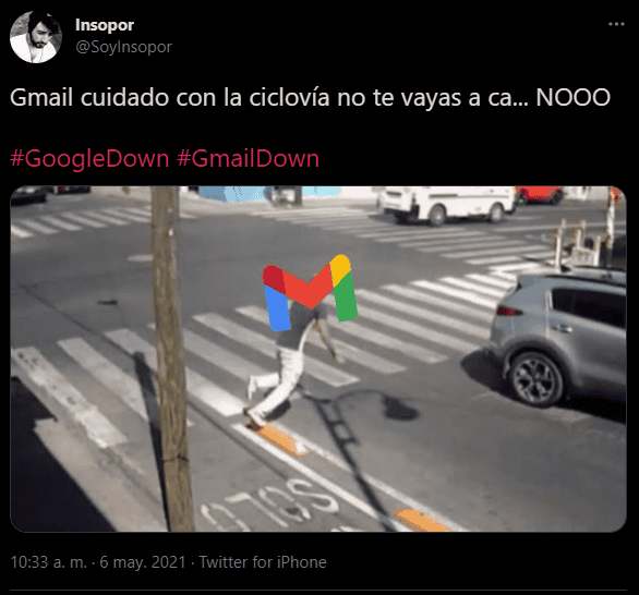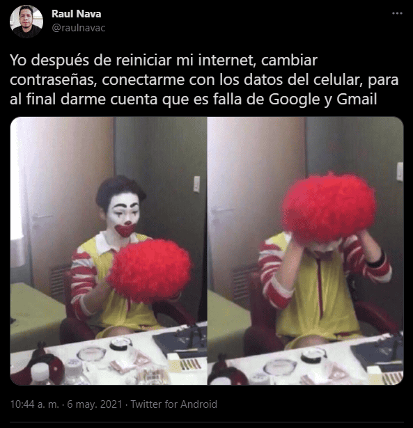 Desde la mañana de este jueves, algunos servicios de Google como Gmail, Meet y Youtube presentaron problemas de conexión con los servidores y algunos usuarios hicieron lo que mejor saben hacer: reaccionar con memes.De acuerdo con la plataforma Downdetector —que muestra cuando algún servicio en Internet falla— las quejas de las herramientas de Google iniciaron alrededor de las 9:30 horas de esta mañana.Según los reportes del sitio, Gmail presenta un problema de conexión y YouTube presenta problemas al cargar los videos y búsquedas en general.Las fallas no se presentan en todo México, sólo en ciudades como Guadalajara, Ciudad de México, Veracruz y Monterrey, entre otros.Hasta el momento, Google no ha emitido algún tipo de comunicado con respecto a esta falla.A continuación algunas reacciones de usuarios en redes sociales: AC