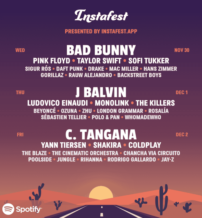 Instafest.app es la nueva tendencia en redes sociales en la que puedes personalizar un cartel de música como si se tratara de tu propio festival. En éste puedes elegir el nombre oficial del evento y las bandas que se presentarán, aunque la página te propondrá los días en los que se "presenten" las bandas.Para crear tu cartel personalizado únicamente debes contar con la app de Spotify, por lo que no será necesario descargar una app adicional.1. Entra a la página Instafest.app. 2. Acepta los términos de privacidad. 3. Personaliza tu cartel eligiendo los mejores artistas de las últimas cuatro semanas o de los últimos seis meses. 4. Elige el estilo que más te guste, las opciones son: Amanecer en Malibú, Crepúsculo de Los Ángeles o Anochecer de Mojave. 5. Debes nombrar tu fiesta, también te da la opción de ocultar tu nombre de usuario o mostrar tu puntuación básica. 6. Por último deberás guardar y descargar.Como ves, es muy sencillo poder personalizar tu propio festival de música, además no tiene ningún costo realizarlo. jb