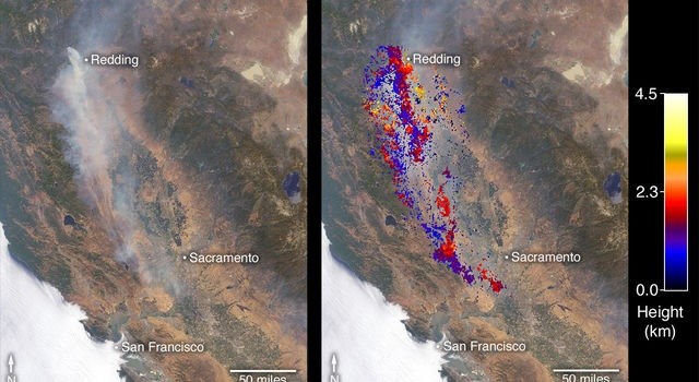 La Administración Nacional de la Aeronáutica y del Espacio (NASA, por sus siglas en inglés), dio a conocer nuevas fotografías satelitales de los incendios forestales que han afectado a California, Estados Unidos. Uno de estos es el incendio de Ferguson que ardió el 13 de julio en el Bosque Nacional Sierra, al oeste del Parque Nacional Yosemite. De acuerdo con la NASA gran parte de dicho bosque sufrió estrés extremo en esta área debido a la prolongada sequía de 2012 a 2017, situación que dejó una gran cantidad de árboles muertos. Asimismo, el 23 de julio ocurrió otro incendio al noroeste del lago Whiskeytown, norte de California, el cual avanzó de manera rápida a la ciudad de Redding, lo que generó evacuaciones masivas. El instrumento MISR en el satélite Terra de la NASA recolectó, a través de sus nueve cámaras que enfocan a la Tierra de diferentes ángulos, las imágenes de ambos incendios mientras pasaba por California el 27 y 29 de julio. Los científicos emplean la información angular de las imágenes de MISR para calcular la altura de la columna de humo, cuyos resultados se superponen en el lado derecho de cada figura. Los datos finales muestran que el humo de los dos incendios, permaneció cerca del suelo; esto tuvo un impacto sobre la calidad del aire local durante esos días.JB