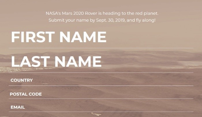 La NASA abrió una convocatoria para que las personas que deseen puedan enviar su nombre a Marte en 2020.A través de un comunicado anunció que al inscribirse, los usuarios obtendrán un "pasaje de abordar" en forma digital como comprobante y su nombre viajará dentro de un chip en la próxima misión de Mars 2020."¿Quieres acompañarme en Marte? Envía tu nombre a la superficie del planeta rojo con el @NASA próximo Rover, #Mars2020", se lee en un tuit de la cuenta de Curiosity Rover, que es el robot diseñado para investigar al planeta rojo.Hasta el momento hay más de cinco millones de nombres registrados y la convocatoria cerrará hasta el 30 de septiembre.Para poder hacer el registro es muy sencillo: sólo debes escribir tu nombre y tu apellido, seguido de tu país, tu código postal y tu mail en donde te enviarán tu "pase de abordar" que podrás imprimir, compartir y guardar.La misión espacial Mars 2020 dirigida por la NASA, está programada para ser lanzada en julio del 2020 desde Cabo Cañaveral, Florida.Su objetivo es investigar la superficie, los procesos geológicos y la historia de Marte, incluida la evaluación de su pasado, habitabilidad y posibilidad de preservar las biofirmas dentro de los materiales geológicos accesibles.La misión podría aterrizar en el cráter Jezero4 localizado en el Cuadrángulo de Syrtis Major.JB