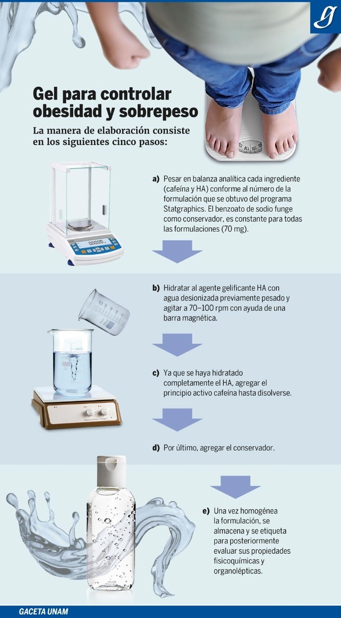 Investigadores de la Universidad Nacional Autónoma de México (UNAM) desarrollaron un gel y un parche transdérmico con propiedades de la cafeína para combatir el sobrepeso y la obesidad, uno de los padecimientos que afecta a la mayoría de la población mexicana, y que con el tiempo, podrían desencadenar enfermedades crónico degenerativas. Los especialistas de la UNAM basaron su fórmula farmacológica en cafeína pues tiene un efecto lipolítico, elemento que es capaz de disolver la grasa en ciertas cantidades. Es por ello que optaron por el uso de un parche en el que la piel sea capaz de absorber las propiedades necesarias para efectos eficaces. José Juan Escobar Chávez, investigador de la Facultad de Estudios Superiores (FES) Cuautitlán, aclaró que el uso, tanto del gel como del parche, sólo ayudará a controlar el desequilibrio del peso, por consiguiente es necesario llevar a cabo una dieta balanceada, actividad física y prácticas que contribuyan a mantener una buena salud. En cuanto a la conformación del parche, el responsable del laboratorio de Sistemas Transdérmicos de la facultad de Cuautitlán Izcalli explicó que es una película transdérmica que la piel es capaz de absorber, similar a las capsulas que contienen medicamento: "Es una especie de burbuja con gel, y encima tiene una placa permeable que se adhiere a la piel y permite el paso del fármaco". Además, especificó que el parche debe colocarse en las zonas del cuerpo donde no haya presencia de vello, por ejemplo en el antebrazo, la espalda y el abdomen. Dicho adhesivo ya se encuentra en proceso de ser patentado y contar con la exclusividad para su producción y distribución. Mediante un comunicado, la Máxima Casa de Estudios expuso que la irregularidad en el peso podría ocasionar condiciones más delicadas en la salud del paciente, como lo son la diabetes, presión arterial alta y niveles elevados de colesterol y triglicéridos."Es importante atacar estos problemas desde el punto de vista médico, pues las nuevas generaciones ya los presentan desde edades muy tempranas. Además, la situación repercute tanto en el sistema de salud como en la economía del país", afirmó Escobar Chávez.De acuerdo a cifras de 2018 de la Encuesta Nacional de Salud y Nutrición (Ensanut), siete de cada 10 mexicanos padecen sobrepeso y obesidad. Esta problemática ha llamado la atención de los expertos, pues las nuevas generaciones presentan altos índices de masa corporal (IMC) a edades muy tempranas.Actualmente, los científicos de la UNAM se encuentran en la espera de la autorización para llevar a cabo pruebas en modelos animales, pues ya cuentan con la formulación y optimización del gel y el parche, con lo que determinaron su tamaño y la dosis terapéutica adecuada para su administración.AC