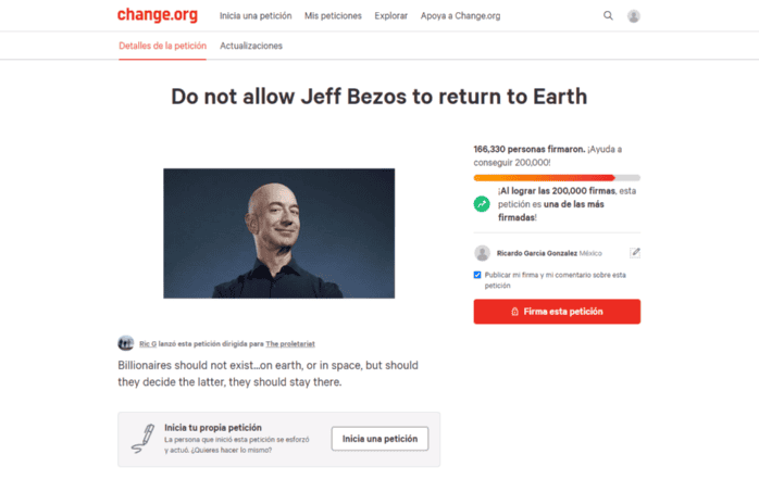 El increíble vuelo de Jeff Bezos al espacio realizado este martes 20 de julio de 2021 a través de la compañía Blue Origin fue un éxito y un hito histórico, aunque en Internet las opiniones han resultado diversas al respecto. En concreto, un cibernauta que creó a través del sitio Change.org una petición para que el hombre más rico del planeta no regresara a la Tierra.Dentro de la aeronave fabricada por la compañía aeroespacial creada por Bezos, también viajaron su hermano, Mark; la piloto Wally Funk, de 82 años; y Oliver Daemen, un estudiante neerlandés de 18 años e hijo de un multimillonario. Pese a que la emoción por el suceso fue global, también la iniciativa de Ric G (según su nombre de usuario en la plataforma de peticiones) adquirió miles de adeptos rápidamente desde su creación el pasado 24 de junio de 2021.“No permitas que Jeff Bezos regrese a la Tierra” es el nombre de la petición que acumulaba hasta el mediodía de este martes, más de 166 mil firmas de una meta de 200 mil, dirigida al proletariado, según el autor; “los multimillonarios no deberían existir… en la Tierra o en el espacio, pero si deciden lo último, deberían quedarse ahí”, se lee en la descripción.En la primera actualización de dicha petición, Ric manifiesta su inconformidad por el uso que algunas personas hacen de sus fortunas en lugar de contribuir al combate de la desigualdad económica en los Estados Unidos, por lo que invitaba a las personas a sumarse a firmar su petición, aunque sus deseos de ver a Bezos convirtiéndose en residente espacial para siempre no fueron concedidos.