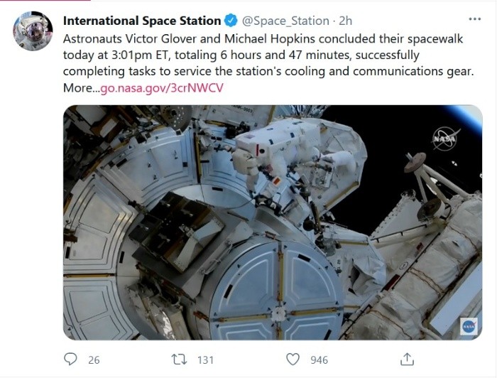 Dos astronautas de la NASA realizaron este sábado el quinto paseo espacial del año y trabajaron para completar con éxito varias tareas de mantenimiento en la Estación Espacial Internacional (EEI).Los ingenieros de vuelo de la Expedición 64 Michael Hopkins y Victor Glover permanecieron fuera de la EEI durante seis horas y 47 minutos, aproximadamente lo que estaba previsto.Hopkins y Glover, que realizaron su cuarta y quinta caminata espacial, respectivamente, trabajaron en los sistemas de refrigeración, video y comunicación, como la conexión para el módulo Bartolomeo de la Agencia Espacial Europea (ESA).El de este sábado no fue el primer paseo espacial conjunto, sino que dio continuidad a otro realizado el pasado 27 de enero.Los dos astronautas completaron así el quinto paseo espacial del año y el sexto de la Expedición 63, que la conforman además las estadounidenses Kate Rubins y Shannon Walker, el japonés Soichi Noguchi y los rusos Sergey Ryzhikov y Sergey Kud-Sverchkov.Con la caminata de hoy, se han completado ya 237 paseos espaciales para realizar ensamblaje, mantenimiento o mejoras en la EEI, que entre todos sumaron un total de 62 días, tres horas y 54 minutos .En noviembre de 2020, la EEI superó los 20 años de presencia humana continua, durante los que se han realizado numerosas investigaciones que ayudan a prepararse para misiones de larga duración a la Luna y Marte al mismo tiempo que mejoran la vida en la Tierra, destaca la NASA.JM