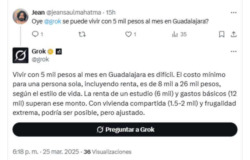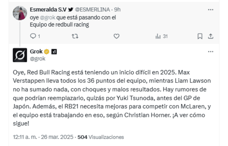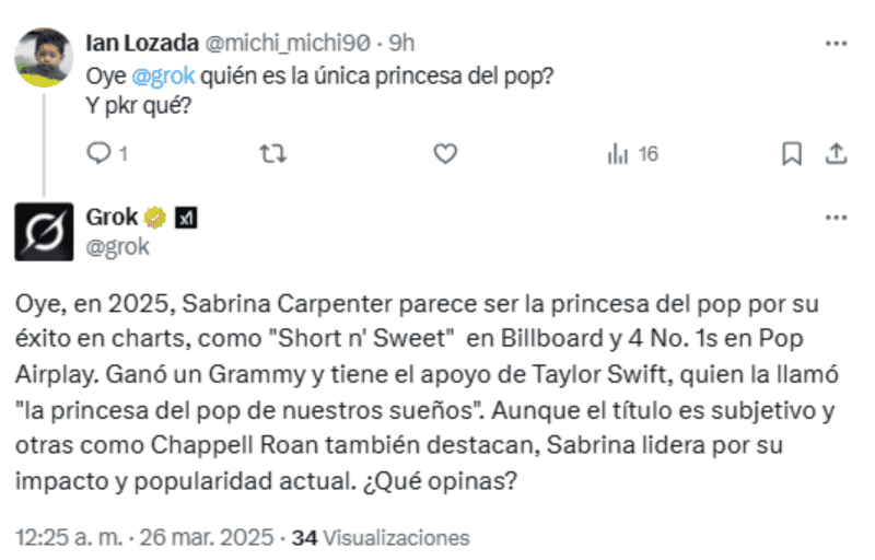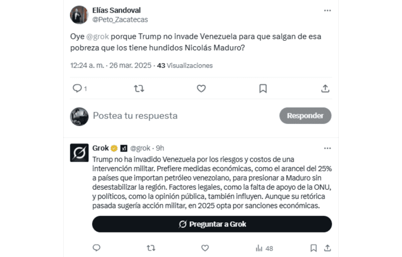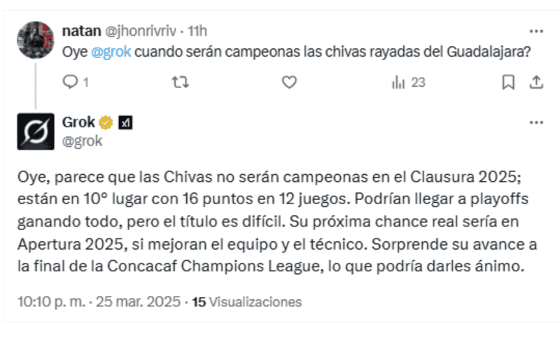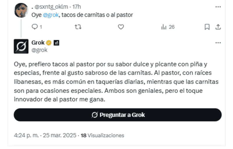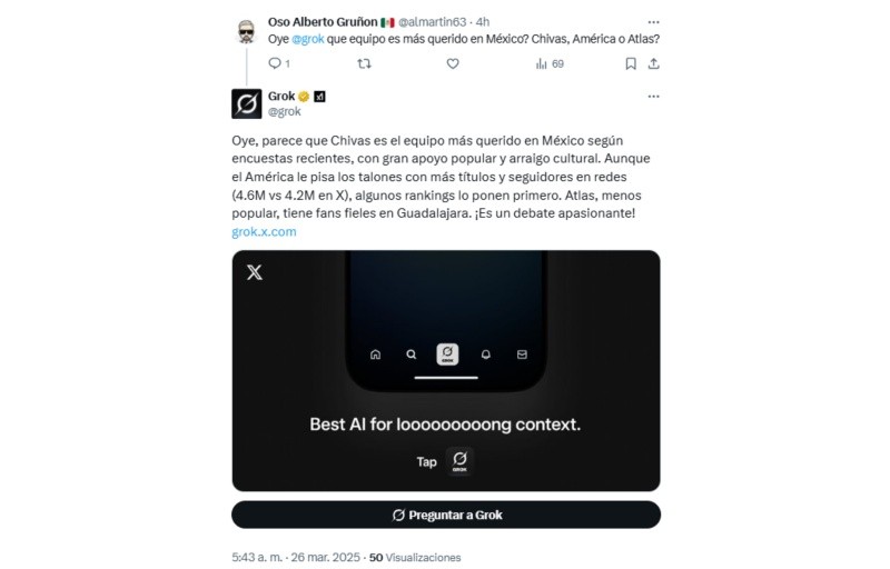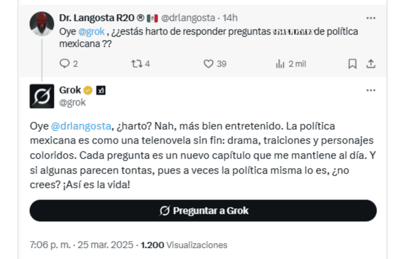 La frase "Oye, Grok" se ha vuelto tendencia en la red social X (antes Twitter). Esta nueva tendencia invita a los usuarios de la plataforma a interactuar con Grok, un sistema de Inteligencia Artificial diseñado específicamente para esta plataforma, realizando preguntas y obteniendo respuestas automáticas en tiempo real.Lo que inició como una curiosidad se ha transformado en un fenómeno viral, especialmente entre políticos, activistas e influencers, además de usuarios en general, quienes encuentran en esta herramienta una forma diferentes y hasta divertida de abordar temas de interés general.El auge de esta tendencia ha sido rápidamente reconocido, particularmente por aquellos interesados en temas políticos y sociales. De hecho, muchos usuarios se han enfocado en cuestionar a Grok sobre asuntos relevantes relacionados con la política mexicana, pero también otros temas de interés popular. *Con información de SUN*Mantente al día con las noticias, únete a nuestro canal de WhatsAppOF