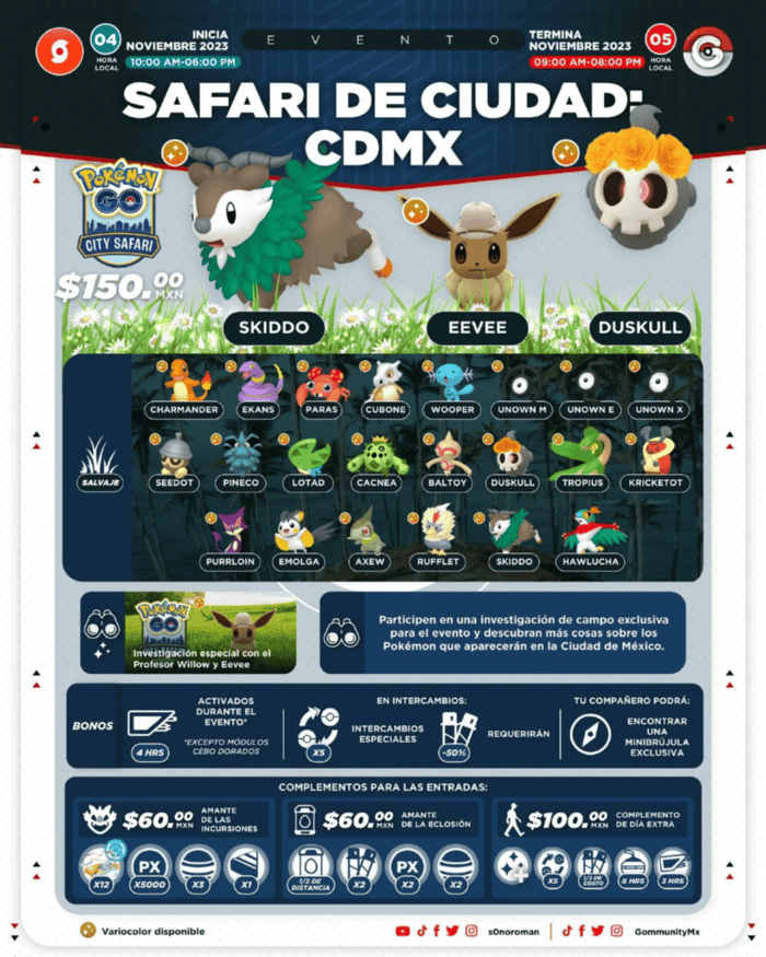 Durante un evento de prensa en una terraza con una hermosa vista de la capital, Niantic anunció un nuevo formato de evento en vivo, el Pokémon GO City Safari, que tendrá como sede a la Ciudad de México.Dicho evento se realizará el 4 y 5 de noviembre en toda la ciudad, y en él los Entrenadores podrán participar y atrapar diferentes Pokémon salvajes, unirse a una investigación especial exclusiva y mucho más."Para nosotros en Niantic es muy importante realizar este tipo de eventos en México, ya que nos permite traer nuevas experiencias a nuestros Entrenadores y reforzar los lazos de nuestra comunidad, una de las más grandes de todo el mundo”, destaca Alan Mandujano, Head of Latin America en Niantic. "Con City Safari buscamos que todos los que participen vivan la aventura a su manera, capturen distintos Pokémon mientras exploran esta gran ciudad, y hagan amigos durante el camino".La entrada tiene un costo de 150 pesos mexicanos (impuestos y cargos incluidos) y ya está disponible la venta en la página de Niantic en https://tickets.nianticlabs.com/events/pgo.Los Entrenadores pueden elegir participar el día sábado o el domingo, o también podrán adquirir un complemento opcional de segundo día con un costo de 100 pesos para aprovechar al máximo el fin de semana y sumarse a la aventura recorriendo los emblemáticos monumentos históricos de la ciudad.Durante el 4 de noviembre el evento se realizará en un horario de 10:00 hrs a 18:00 hrs (hora local), mientras que el 5 de noviembre el evento iniciará de las 9:00 hrs a las 14:00 hrs y continuará de las 17:00 a 20:00 hrs.La razón de este intermedio de tres horas es para que los jugadores puedan unirse al Día de la Comunidad de noviembre que se celebrará ese mismo día.En esta experiencia única en su tipo, el Profesor Willow le pedirá a los Entrenadores que recorran la Ciudad de México para aprender más sobre los Pokémon que aparecerán durante el evento, entre ellos un Eevee con sombrero de explorador que obtendrán al comienzo de la Investigación Especial del City Safari.Además, los Entrenadores podrán disfrutar de la primera aparición de Skiddo en Pokémon GO y apariciones de favoritos como Duskull, el cual tendrá una corona de Cempasúchil para conmemorar la tradición del Día de Muertos; Hawlucha, un Pokémon inspirado en la tradición de la Lucha Libre; o Wooper, un Pokémon inspirado en el emblemático ajolote. Por otro lado, durante el evento los Entrenadores también podrán capturar Pokémon en estado salvaje como Charmander, Ekans, Cubone, Unown M, Unown E, Unown X, Lotad, Cacnea, Tropius, Axew, Rufflet y muchos más. ¡Y con suerte, también podrían encontrarlos en su forma variocolor!Además, los jugadores que se sumen al City Safari en Ciudad de México podrán recibir exclusivos bonos y recompensas como: Incienso activado por 8 horas, Módulos de Cebo que estarán activados por cuatro horas (exceptuando los dorados), y hasta 5 intercambios especiales por día que, al igual que los intercambios normales, requerirán 50% menos Polvos Estelares, entre otras sorpresas.También se ofrecerá a los Entrenadores la oportunidad de mejorar su experiencia en el evento con dos complementos opcionales: uno para los amantes de las incursiones, el cual otorgará hasta 12 Pases de Incursión gratis al girar los fotodiscos en Gimnasios, un bono de 5,000 PX por incursión completada, 3 caramelos adicionales y 1 caramelo XL adicional en incursiones de 5 estrellas; y otro complemento para los fans de eclosionar huevos, el cual les otorgará distancia reducida a la mitad para eclosionar, mmás doble Polvoestelar, PX y caramelo al eclosionar huevos. Estos complementos están disponibles con un costo de 60 pesos mexicanos cada uno (impuestos y cargos incluidos).Para más detalles sobre el Pokémon GO City Safari, los “Días de la Comunidad”, eventos especiales y nuevas adiciones al juego, por favor visita el blog y las redes sociales oficiales de Pokémon GO.Además, les recordamos a los Entrenadores que presten siempre atención a su entorno y acaten las normas de las autoridades sanitarias al jugar a Pokémon GO.AH