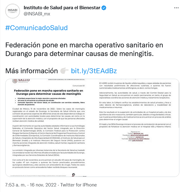 La meningitis aséptica es una enfermedad que ha tenido en alerta a los servicios de salud del estado de Durango, donde se han registrado múltiples casos que estaban bajo vigilancia y tratamiento médico. Pero, ¿qué es?De acuerdo con el Manual de Merck de Estados Unidos, el nombre de meningitis viral se utiliza como sinónimo de meningitis aséptica, aunque el segundo se refiere a la meningitis aguda que es ocasionada por algo diferente a las bacterias que causan la meningitis bacteriana.La meningitis aséptica puede ser provocada por virus, trastornos no infecciosos (por el uso de fármacos u otras enfermedades, por ejemplo), hongos, y otros organismos.El Western New York Urology Associates indica que la meningitis se caracteriza por la inflamación del recubrimiento del cerebro (llamado meninges). La meningitis aséptica se presenta cuando hay signos de meningitis, sin embargo, cuando se toma una muestra de líquido cefalorraquídeo, las bacterias no crecen.Este padecimiento a menudo tiene tratamiento, y en muchos casos, la recuperación es de siete a 10 días.Entre los síntomas que se presentan se encuentran dolor de cabeza, fiebre y escalofríos, cuello rígido, sarpullido, sensibilidad a la luz, náuseas y vómitos; no obstante, al ser síntomas de otras enfermedades recomiendan visitar a un médico por cualquier cosa.El Instituto de Salud para el Bienestar (Insabi) informó a través de su cuenta de Twitter que derivado de la situación en Durango, la Federación pone en marcha operativo sanitario en esa entidad para determinar las causas de meningitis.Indica que según el corte al 14 de noviembre, se encuentran en estudio 49 casos de meningitis, de los cuales 47 son mujeres a quienes les fueron practicados procedimientos quirúrgicos obstétricos; y dos varones con antecedente de cirugía. Todos los casos en protocolo tienen como antecedente haber recibido bloqueo neuroaxial.Hasta el momento se han reportado seis decesos. Actualmente, se encuentran 10 pacientes en terapia intensiva; siete atendidos en el Hospital General 450 de la Secretaría de Salud estatal y tres en el Hospital General de Zona No. 1 del IMSS, con pronóstico reservado.OF
