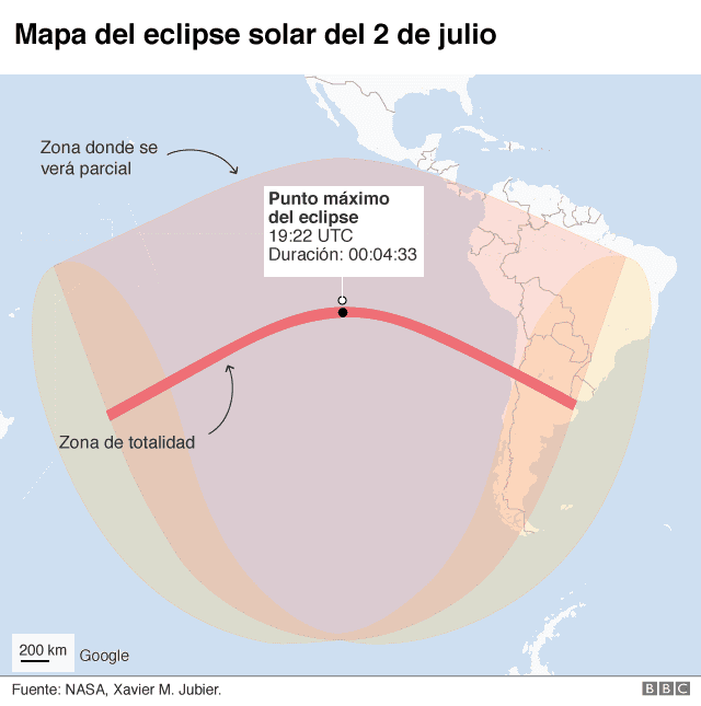 Los eclipses son eventos astronómicos espectaculares. No en vano existe todo un turismo relacionado con su avistamiento.Para este martes 2 de julio, por ejemplo, se esperan cientos de miles de turistas en las zonas de Chile y Argentina donde el eclipse solar será total.Y si bien su espectacularidad será menor en el resto de la región, otros millones de personas igual disfrutarán del eclipse solar parcial.Pero el llamado "gran eclipse Sudamericano" es apenas uno de diversos tipos de eclipses."De forma general existen dos tipos de eclipses: los de Luna y los de Sol", escribe Juan Carlos Beamín, astrofísico del Centro de Comunicación de las Ciencias de la Universidad Autónoma de Chile, en su reciente libro "Astronomía ilustrada".Pero acota: "Técnicamente existe un tercer tipo que involucra dos estrellas".En BBC Mundo te contamos cómo son estos tres y sus distintas variantes.A veces, cuando la Luna orbita la Tierra, se interpone entre el Sol y nuestro planeta, bloqueando la luz del astro y provocando un eclipse solar. En otras palabras, lo que hace la Luna es proyectar una sombra sobre la Tierra.Existen tres tipos de eclipses solares que se diferencian entre sí por cuánto tapa la Luna al Sol.Este es el tipo de eclipse solar que se verá este martes desde partes de Chile y Argentina.El eclipse solar total sucede cuando el Sol, la Tierra y la Luna se alinean de tal forma que esta última bloquea la luz solar por completo.Tal es así que, durante segundos o incluso minutos, el cielo se vuelve tan oscuro que parece de noche.En palabras de la NASA, "los eclipses solares totales son solo posibles en la Tierra debido a una coincidencia celestial".Es que el Sol es 400 veces más ancho que la Luna, pero también está 400 veces más lejos."Esa geometría significa que cuando se alinean a la perfección, la Luna bloquea toda la superficie del Sol, creando un eclipse total de sol", agrega la NASA. Al recorrido de la sombra de la Luna a través de la superficie de la Tierra se le llama "franja de totalidad" y es en esa pequeña área donde se ve ese espectáculo de completa oscuridad.A ambos lados de esta franja se genera una extensión de miles de kilómetros de amplitud, desde donde el eclipse se ve de forma parcial.Cuanto más lejos se esté de la franja de totalidad, menor será la fracción del área solar eclipsada.En el caso del eclipse solar de este martes, por ejemplo, en Buenos Aires el oscurecimiento será del 99,7% ya que apenas cae por fuera de la franja de totalidad.En cambio, en Managua, ubicada subre el límite del eclipse en general, el oscurecimiento será de tan solo 0,1%.Respecto a la duración, esta depende de "la posición de la Tierra con respecto al Sol, de la Luna respecto a la Tierra y de qué parte de la Tierra está siendo oscurecida", escribe Beamín."Teóricamente, el eclipse solar más largo podría durar 7 minutos con 32 segundos", agrega el astrofísico chileno.En cuanto a su frecuencia, no son tan raros como se suele creer, pues ocurren cada unos 18 meses.Lo realmente raro es que un eclipse solar total sea visible desde un mismo lugar, como una ciudad en particular, algo que pasa en promedio cada unos 375 años. Cuando la Luna está más alejada de la Tierra y está "más pequeña", no alcanza a tapar por completo a la superficie del Sol.Entonces, se genera un anillo de Sol en torno a la Luna, evento que se denomina eclipse solar anular.De forma análoga a lo que sucede durante un eclipse solar total, durante este fenómeno se genera una "franja de anularidad" en la cual el eclipse se ve como anular.A ambos lados de dicha trayectoria, a su vez, se genera una zona de parcialidad.El 14 de octubre de 2023, por ejemplo, habrá un eclipse de este tipo cuya franja de anularidad recorrerá partes de Estados Unidos, México, Guatemala, Honduras, Nicaragua, Costa Rica, Panamá, Colombia y Brasil.No obstante, todos los países del continente americano podrán ver este eclipse al menos de forma parcial en alguna parte de su territorio.Según la NASA, estos eclipses suelen ser los más largos, ya que el anillo puede incluso vislumbrarse por más de diez minutos, aunque en general no duran más de cinco o seis.Beamín explica que el eclipse híbrido es un fenómeno que se da "cuando la Luna está justo a la distancia donde sería capaz de cubrir al Sol por completo, pero, a medida que avanza, se aleja ligeramente de la Tierra y deja de eclipsar al Sol transformándose en un eclipse anular".Y continúa: "También puede comenzar como un eclipse anular y luego acercarse un poco para convertirse en un eclipse total".Estos eclipses constituyen tan solo el 4% de los solares, según el Instituto de Astrofísica de Canarias (IAC).De acuerdo a datos de la NASA, el último ocurrió en 2013 y el próximo tendrá lugar recién el 20 de abril de 2023, siendo visible en Indonesia, Australia y Papúa Nueva Guinea.Un eclipse lunar sucede cuando la Tierra es la que se interpone en el camino de la luz del Sol hacia la Luna.En otras palabras, durante un eclipse lunar, lo que se ve es la sombra de la Tierra proyectada sobre su satélite natural.Como explica una guía didáctica del IAC, "la visibilidad de los eclipses de Sol depende de la situación geográfica del observador. Por el contrario, en los eclipses de Luna el fenómeno se observa desde cualquier lugar de nuestro planeta donde la Luna se encuentre por encima del horizonte a la hora del eclipse".Además, se agrega, "a diferencia de los eclipses de Sol, en los que el horario de las fases del eclipse depende de la posición geográfica del observador, en los eclipses lunares éstos serán los mismos independientemente del lugar de observación".También existen tres tipos de eclipses lunares. Durante un eclipse lunar total, explica la NASA, la Luna y el Sol están en lados exactamente opuestos a la Tierra."Aunque la Luna está en la sombra de la Tierra -aclara la NASA-, algo de luz solar llega a la Luna".Dicha luz solar pasa a tra