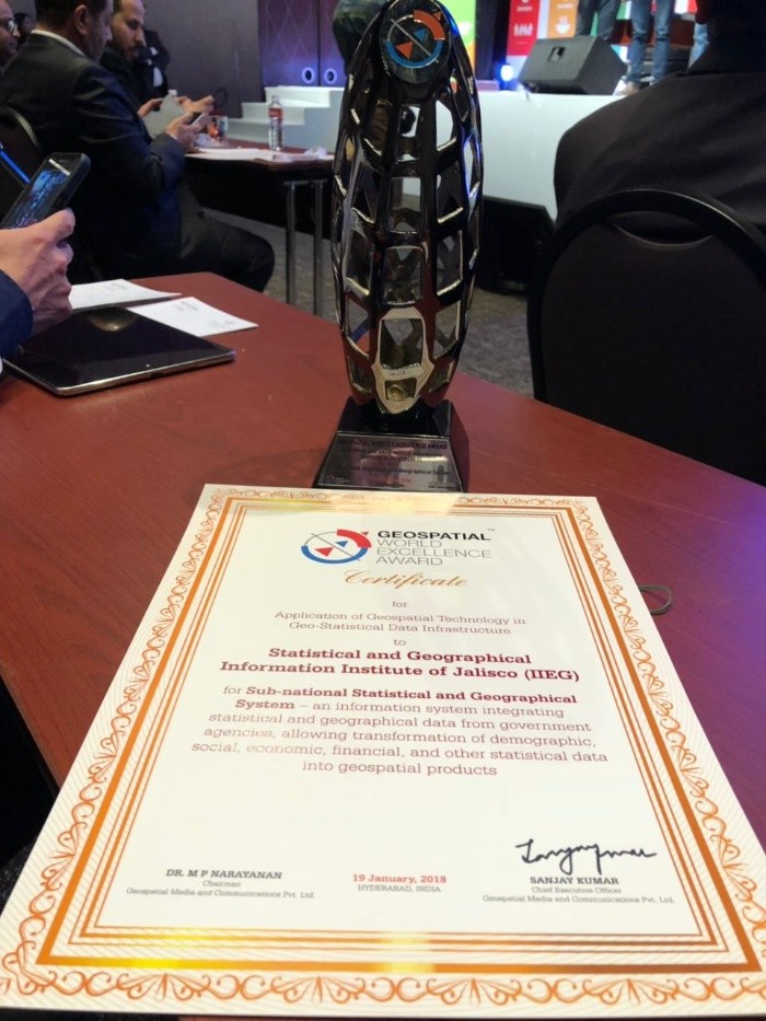 El Instituto de Información Estadística y Geográfica del Estado de Jalisco (IIEG), recibió el Premio Mundial Geoespacial (Geospatial World Awards) en la categoría Políticas y Programas Geoespaciales durante el Foro Mundial Geoespacial realizado en Hyderabad, India.En concreto, se reconoce al Sistema Estadístico y Geográfico de Jalisco, que permite referenciar la información estadística sobre el territorio, y facilita la transformación de los datos en productos geoespaciales que son de libre acceso, gratuitos y listos para ser consultados o descargados a través de plataformas amigables, servicios web y datos abiertos.Este premio ha sido ganado, en años anteriores, por la NASA, FAO, la Agencia Europea de Medio Ambiente y la Policía de Transporte Británica, entre otros.Dicho galardón se otorgó al Sistema Estadístico y Geográfico de Jalisco –administrado y desarrollado por el IIEG- en el foro organizado por Geoespatial Media and Communication en asociación con más de 20 instituciones con prestigio internacional entre las que destacan el Comité de Expertos de Naciones Unidas en Gestión Global de Información Geoespacial (UNGGIM), la Asociación Cartográfica Internacional (ACI), la Sociedad Internacional de Fotogrametría y Teledetección (isprs), la Asociación Europea de Compañías de Teledetección (EARSC), el consorcio Unigis, además de empresas como Oracle, Airbus, Trimble, Faro, Hexagon, Bentley, Urthecast, entre otras.SABER MÁSEl Premio Mundial Geoespacial reconoce innovaciones y prácticas ejemplares en la industria geoespacial en tres categorías: • Premios a la excelencia de aplicaciones geoespaciales • Premios a la innovación tecnológica geoespacial • Premios a la implementación de políticas y programas geoespaciales (Al que se hizo merecedor el Instituto de Información Estadística y Geográfica del Estado de Jalisco en 2018)