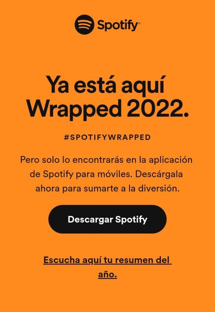 En este último mes del 2022 Spotify lanzó, como cada año, la opción para poder ver tus Wrapped, el cual es un resumen que la aplicación genera con base a estadísticas del material que más escuchaste durante los primeros meses del año, como artistas, álbumes, canciones, entre otras opciones.Como en años anteriores, como es ya costumbre, este resumen anual lo vas a poder obtener a través de las aplicaciones móviles de Spotify, aunque los datos de escucha que muestran son los de Spotify en todas las plataformas en donde hayas usado la aplicación.Para ello, deberás de abrir la app y buscar la opción recopilatoria de “Mi Spotify 2022”, como se muestra a continuación:En caso de que no te aparezca esta opción puedes ingresar al sitio oficial de Spotify (Spotify.com/es/wrapped) y pulsar la opción “Escucha aquí tu resumen del año”, con la cual podrás acceder directamente a la app o continuar navegando en la web.Una vez que ya hayas accedido a la plataforma en la sección de Wrapped, te darás cuenta de que cuenta con seis diapositivas o secciones de estadísticas: Géneros, Bandas Sonoras, Horas de Escucha, Canciones, Canciones Escuchadas, Playlist, y Artistas. Cada una de ellas podrás visualizarlas dando clic en la sección, lo cual, en consecuencia, nos arrojará nuestras pizarras personales.Géneros: Esta diapositiva te mostrará la lista de los cinco géneros musicales que más escuchaste en los últimos meses. Bandas Sonoras: En la siguiente y tercera sección, te aparecerá el tipo de música que tiendes a escuchar en los tres momentos del día: mañana, tarde y noche.Horas de Escucha: En esta sección se te va a mostrar la cantidad de minutos que has pasado escuchando música en Spotify durante los últimos meses.Canciones: La cuarta sección te muestra las canciones que más has escuchado en el último año. En esta lista se incluye también el día en el que más la escuchaste y la cantidad total de veces que lo hiciste durante el año.Canciones Escuchadas: En esta diapositiva primero se te muestra el total de canciones diferentes que ha escuchado en el año. Al final, se te enlistará el top 5 con las cinco canciones más escuchadas durante este periodo de tiempo.Playlist: Luego de enseñarte tus canciones más escuchadas, Spotify te generará en esta sección una lista de reproducción con las 100 canciones que más has escuchado a lo largo del año y la guardará tu biblioteca. Cabe mencionar que también podrás compartir tu Playlist de Spotify Wrapped 2022.Artistas: Finalmente, la app te mostrará primero cuál es el artista que más has escuchado durante el 2022. Una vez lo haga, también pasará a mostrarte la lista de los cinco artistas que más escuchaste este año. Son dos diapositivas diferentes que puedes ir compartiendo. MS