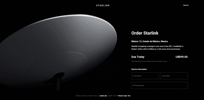 El servicio de Internet Starlink, propiedad de Elon Musk, tiene planes de ofrecer cobertura en México a finales de 2021, según revela su sitio oficial.Además, Starlink ya permite pre-registrarse para ser uno de los usuarios que prueben el Internet de Musk. “Starlink está disponible para un número limitado de usuarios por área de cobertura en este momento”, se lee en el sitio starlink.com. “Los pedidos se procesarán por orden de llegada”. Los requisitos que pide el sitio web son un correo electrónico y la dirección del servicio. Al indicar la ciudad de Guadalajara, Jalisco, y el Estado de México, la firma menciona que la cobertura llegará a finales de 2021 y tendrá un costo de 99 dólares.Otros datos que Starlink pide son el nombre, teléfono y datos de facturación donde se puede agregar una tarjeta de crédito o débito.La versión Beta de Starlink permite a los usuarios navegar con velocidades de datos que varían de 50 Mb y 150 Mb. La cobertura mejorará según la compañía vaya instalando más satélites y estaciones terrestres.Para mayor información y detalles sobre Starlink, consulte el sitio oficial.AC