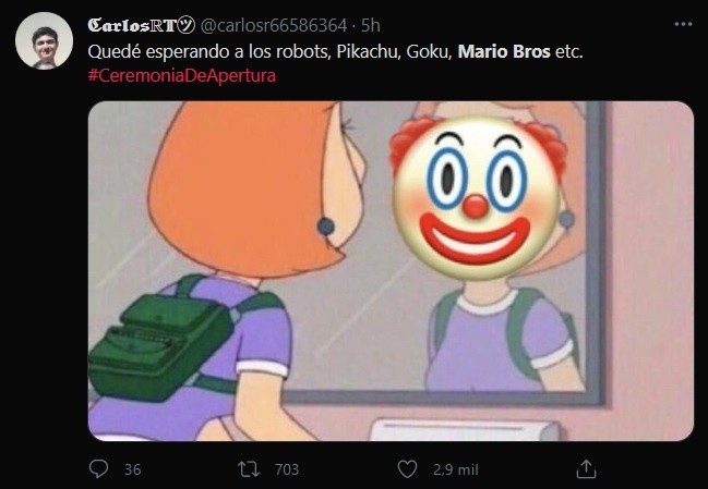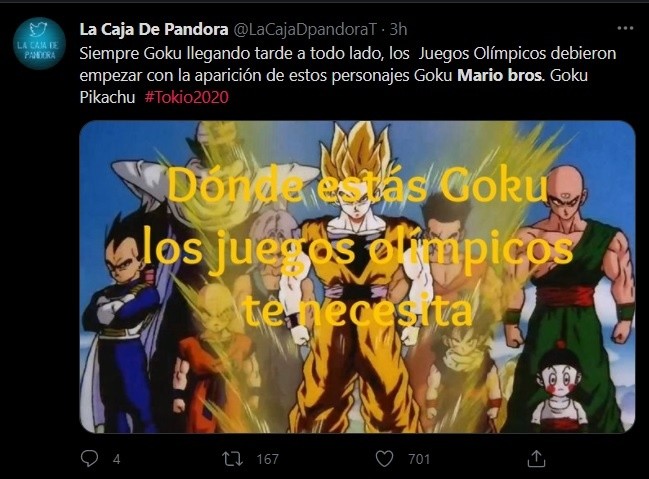 Tras la inauguración de los Juegos Olímpicos la mañana de este viernes (6:00 horas, tiempo de México) los fans del deporte y de Japón compartieron sus comentarios en redes sociales, algunos indignados porque no aparecieron personajes emblemáticos de la región como “Goku”, “Pikachu”, “Mario Bros”, entre otros. “Siempre Goku llegando tarde a todos lados, los Juegos Olímpicos debieron empezar con la aparición de estos personajes”, dijo el usuario @LaCajaDpandoraT y adjuntó un meme de la serie “Dragon Ball Z”.Otro usuario agregó: “Quedé esperando a los robots, Pikachu, Goku, Mario Bros. etc”. A continuación más reacciones y memes de la inauguración de los Juegos Olímpicos de Tokio 2020:Ya arde la llama más esperada, la que tuvo que aguardar un año para ser encendida, y aún así para muchos es una irresponsabilidad haberla iniciado. Eso explica las multitudinarias protestas a un costado del estadio Nacional de Japón. Pero también es el fuego de la esperanza para muchos corazones que desean volver a la normalidad, esa que les fue arrebatada hace poco más de un año por un silencioso virus que también se ha llevado más de cuatro millones de vidas en todo el orbe.En medio de protestas, han sido inaugurados los Juegos de la XXXII Olimpiada, esos que prometen ser el bálsamo que muchos corazones necesitan y la esperanza de que todo vuelva a la calma, aunque su país anfitrión está en nueva emergencia por el COVID-19.Ceremonia inaugural ecléctica, con los dulces y enigmáticos aderezos que ofrece la milenaria cultura japonesa, pero también con la muestra del poder tecnológico que distingue a la genuina potencia asiática.Para saber más sobre Tokio 2020, no te pierdas nuestra cobertura especial.Con información de SUN.***Sigue leyendo...Si te interesó esta noticia y quieres saber más, entonces descarga y descubre INFORMAPlus, la aplicación digital de EL INFORMADOR, en donde tenemos contenidos exclusivos, seleccionados por nuestros editores, para darles una experiencia más completa a los lectores.Descarga la aplicación y pruébala GRATIS por treinta días.Para iOS: https://apple.co/35jaVgbPara Android: https://bit.ly/3gwVSEVAC