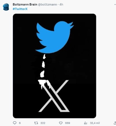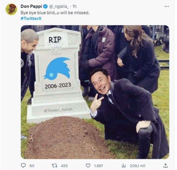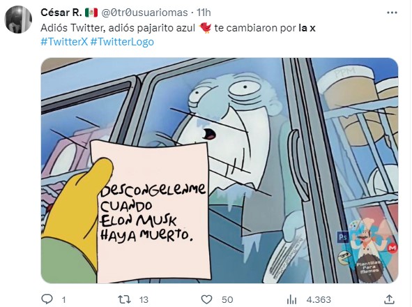 Elon Musk decidió cambiar el logotipo de Twitter, el icónico "pajarito" que ha sido la insignia de la marca desde 2006, por una letra "X". Desde la mañana de este lunes, al acceder a Twitter en su versión web, ya es posible ver la "X" en la esquina superior izquierda, donde hasta hace apenas unas horas estuvo el emblemático pájaro asociado a la imagen de Twitter. El cambio no ha sido del agrado de los usuarios, y como ya es costumbre, la red social ha sido invadida por memes que toman con burla y gracia la nueva actualización realizada por Elon Musk, una acción adicional en su polémico manejo de Twitter.Aquí algunos de los mejores memes que le dicen adiós al pájaro de Twitter: FS