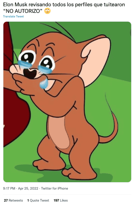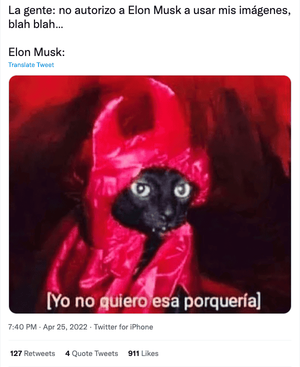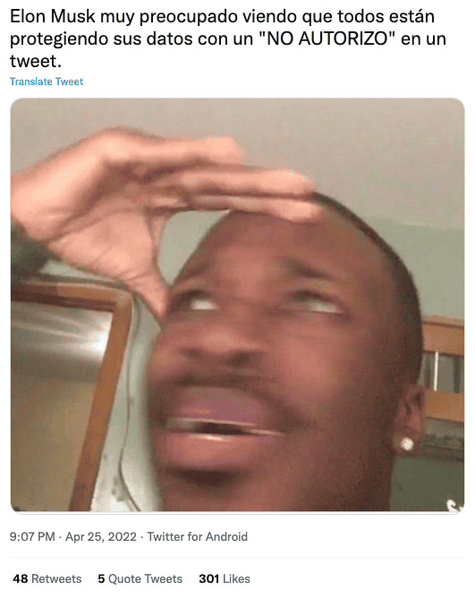 Después de que Twitter llegara a un acuerdo con Elon Musk para venderle la red social, se ha vuelto tendencia la frase “No autorizo”, que prohíbe al empresario a hacer uso de datos personales de los usuariosEste 25 de abril se ha anunciado de manera oficial que el empresario, Elon Musk, CEO de Tesla y SpaceX— llegó a un acuerdo para comprar Twitter por aproximadamente 44 mil millones de dólares. Se espera que la negociación se cierre a finales de año, pero desde ahora diversos usuarios de la plataforma comienzan a especular qué cambios llegarán a la popular red social. Una de las tendencias principales en Twitter éste 25 de abril es la frase “No autorizo”, ya que los usuarios de la plataforma exigen al próximo dueño de Twitter que no utilice sus datos personales así como ocurrió con Mark Zuckerberg y Facebook.“No autorizo ni doy permiso para que Elon Musk pueda usar mis imágenes, información, mensajes, fotos, mensajes eliminados, archivos, etc. Pasa este mensaje a 10 contactos para que tu perfil quede protegido”, dicen algunos de los tweets publicados tras el anuncio de las negociaciones entre Twitter y Elon Musk.Sin embargo, otras personas se han tomado este tema con humor, y existen infinidad de memes que hacen burla a la paranoia de dichos usuarios. Elon Musk ha declarado que la compra de Twitter se debe a que cree que la red social no estaba cumpliendo con su promesa de servir como una plataforma de libre expresión, por lo que algunas reformas que posiblemente sí ocurrirán en la plataforma será la relajación de las restricciones a sus contenidos y la eliminación de cuentas “fake”. MR