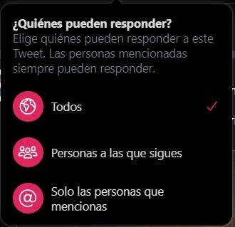 Tras varios meses de pruebas, al fin Twitter lanzó este martes sus nuevas configuraciones para las conversaciones en los tuits y darle más control a los usuarios.Se trata de una nueva opción que permite que las respuestas no deseadas no se interpongan en conversaciones significativas. “A veces, las personas se sienten más cómodas hablando de lo que está sucediendo cuando pueden elegir quién puede responder”, dijo Suzanne Xie, directora de gestión de productos en Twitter.Xie explicó que la función se activa justo antes de que el usuario vaya a tuitear, allí podrá elegir quién puede responder con tres opciones:Las últimas opciones mostrarán una etiqueta para dar a conocer a los demás usuarios si pueden o no responder; sin embargo, siempre será visible, así como dar “me gusta” y retuitear. La nueva función comenzó a probarse en un número limitado de usuarios desde mayo pasado y, al parecer, los resultados fueron favorables para la aplicación.“Estas configuraciones ayudan a algunas personas a sentirse más seguras y podrían conducir a conversaciones más significativas, al mismo tiempo que permiten que las personas vean diferentes puntos de vista”, finalizó.Twitter adelantó que ya se encuentra actualizando la nueva configuración, por lo que en los próximos meses espera agregar una opción para invitar a más personas a las conversaciones después de que se haya tuiteado.AC
