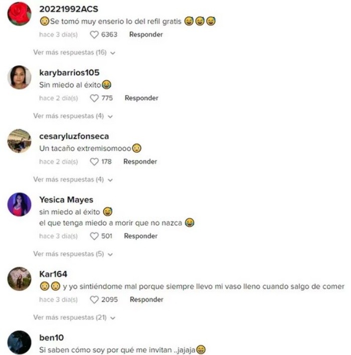 En TikTok circula un curioso video en el que un hombre se pone a rellenar su botella de Coca-Cola de dos litros en un restaurante de comida rápida, aprovechando el refill ilimitado que ofrecen.Dicha situación logró ser captada por el usuario @georgelop19, quien grabó lo que sucedió con un comensal que no dejó pasar la oportunidad.Este video ha provocado más de una risa a los cibernautas que han tenido la oportunidad de verlo.En un clip de apenas nueve segundos de duración, se aprecia la manera en que un sujeto se encuentra rellenado una botella de Coca-Cola de dos litros en la estación de refill para refresco.La grabación muestra al cliente muy tranquilo tomándose su tiempo para llenar su vaso con refresco y después pasarlo a la botella grande.Acompañado con el audio de Bob Esponja “¡¿Qué es eso?!”, el clip de TikTok acumula 3.3 millones de vistas.Por supuesto, los comentarios creativos en el TikTok no se han hecho esperar por parte de los usuarios, quienes encontraron graciosa la acción del hombre.“Se tomó muy enserio lo del refill gratis”, “Sin miedo al éxito”o “Y yo sintiéndome mal porque siempre llevo mi vaso lleno cuando salgo de comer”, se lee en el video original.JM