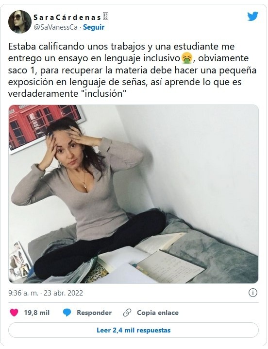 El lenguaje inclusivo se ha vuelto un tema popular que ha generado toda clase de opiniones a favor y en contra de su uso, pues mientras que algunos consideran que es importante eliminar los pronombres masculinos y femeninos para sustituirlos por letras como la x o la e, otros piensan que esto no soluciona el verdadero problema de discriminación.En redes sociales, una maestra identificada como Sara Vanessa Cárdenas causó sensación al expresar su opinión sobre una alumna que escribió su tarea en lenguaje inclusivo, y no dudó en confesar que la había reprobado: "Sacó 1".“Estaba calificando unos trabajos y una estudiante me entregó un ensayo en lenguaje inclusivo, obviamente sacó 1, para recuperar la materia debe hacer una pequeña exposición en lenguaje de señas, así aprende lo que es verdaderamente ‘inclusión’”, se lee en el post.Acompañando la publicación, puso una foto de ella en la que se ve poniendo sus manos sobre su frente mirando hacia la cámara.Al momento, el tuit ha logrado más de 2.6 mil retuits, 1.1 mil tuits citados y 15.8 mil "me gusta".JM