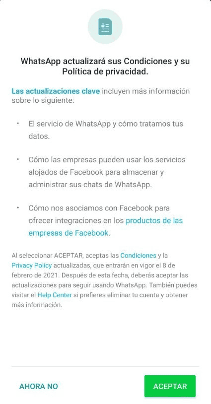 La fecha clave es el 15 de mayo.WhatsApp fijó para este sábado el límite de tiempo que le da a sus millones de usuarios para que acepten los nuevos términos y condiciones de uso que causaron una oleada de críticas a la plataforma a comienzos de este año.Con sus nuevos términos, la plataforma está pidiendo a sus usuarios (excepto a los que residen en la región europea) que acepten compartir datos con Facebook, la firma matriz del servicio de mensajería.A partir de este viernes, quienes no acepten la nueva actualización comenzarán a tener un servicio limitado."No se eliminará la cuenta de ningún usuario ni se quitará el acceso a las funciones de WhatsApp el 15 de mayo debido a esta actualización", dice la plataforma en su web.Pero ¿qué pasa si no aceptas las nuevas condiciones de uso?A partir del 15 de mayo, quienes no acepten los nuevos términos y condiciones no podrán acceder a su lista de chats al abrir el servicio."Pero podrás responder llamadas y videollamadas. Si tienes activadas las notificaciones, podrás tocarlas para leer o responder mensajes, así como para devolver llamadas o videollamadas perdidas", señala la empresa.Esos usuarios podrán interactuar con sus contactos a través de las notificaciones en pantalla.Si después de "unas pocas semanas" el usuario aún no acepta la actualización, ya no recibirá llamadas ni notificaciones y "WhatsApp dejará de enviar mensajes y llamadas a tu teléfono".Las limitaciones no les ocurrirán a todos los usuarios al mismo tiempo, según la compañía.WhatsApp señala que en las últimas semanas ha estado enviado a los usuarios una notificación para que "revisen y acepten los cambios" si no lo han hecho.Pero dentro de unos días, el recordatorio "pasará a ser persistente" hasta que el usuario tome una decisión.Aunque no eliminará la cuenta de quien no acepte, la plataforma sí aplicará su política para cuentas inactivas vigentes.Dichas reglas dicen que si un usuario no ha usado la plataforma por más de 120 días, la cuenta es eliminada "a fin de mantener la seguridad, limitar la retención de datos y proteger la privacidad de los usuarios".Los usuarios pueden exportar su historial de chats como alternativa para no perder sus conversaciones.A comienzos de este año, WhatsApp anunció los cambios que vendrían en sus términos y condiciones de servicio.Indicó que algunos datos de las cuentas de sus usuarios -como los contactos o datos de perfil- serán compartidos con su empresa matriz, Facebook, y que esta podrá hacer lo propio con sus plataformas Instagram y Messenger.Los usuarios de la Unión Europea y Reino Unido, si bien deberán aceptar las nuevas condiciones, no verán aplicarse los cambios en sus cuentas.Las nuevas condiciones generaron una oleada de cuestionamientos sobre las condiciones de privacidad. Algunos usuarios comenzaron a buscar alternativas, como Telegram o Signal.Ante las críticas, WhatsApp optó por diferir el plazo hasta este 15 de mayo y aclarar "rumores e información errónea" en torno al tema."Queremos aclarar que la actualización de la política no afecta de ninguna manera la privacidad de los mensajes que los usuarios comparten con sus amigos y familiares", aseguró la firma."Ni WhatsApp ni Facebook pueden leer tus mensajes ni escuchar las llamadas que haces con tus amigos, familiares o compañeros en WhatsApp. Todo lo que compartan quedará entre ustedes", aseguró la plataforma en su comunicado del lunes.Cristian León, responsable del programa de innovación de la organización civil Asuntos del Sur, con sede en Argentina, explicó a BBC Mundo por qué son tan valiosos los datos de los usuarios de la plataforma."WhatsApp posee muchos metadatos, que es la información que se obtiene de cualquier mensaje que enviamos, como la marca del teléfono, la hora del mensaje, tu ubicación y otros. Con ello puede saber mucho de sus usuarios", dijo León.***Ahora puedes recibir notificaciones de BBC Mundo. Descarga la nueva versión de nuestra app y actívalas para no perderte nuestro mejor contenido.