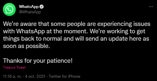 Uno de los servicios más grandes de mensajería del mundo, WhatsApp, presentó este lunes varios inconvenientes en su servicio. Los usuarios reportaron los problemas a través de las redes sociales, además de utilizarlas como medio para comunicarse.Debido a que el servicio ha tardado en restablecerse, tanto WhatsApp como Facebook, publicaron algunos mensajes en sus cuentas oficiales de Twitter, en los que pidieron disculpas a sus usuarios por los inconvenientes de las fallas; sin embargo, no informaron de las causas de la caída en sus plataformas."Somos conscientes de que algunas personas están experimentando problemas en este momento. Estamos trabajando para que todo vuelva a la normalidad y enviaremos una actualización aquí lo antes posible. ¡Gracias por su paciencia!", indicaron WhatsApp y Facebook."Estamos trabajando para devolver las cosas a la normalidad tan rápido como sea posible, y pedimos disculpas por cualquier inconveniente", apuntaron desde la red social.Aún se desconocen las razones técnicas que llevaron a la caída del servicio.Cabe decir que WhatsApp no es una aplicación que en sus inicios fuera desarrollada por Facebook, sino que fue creada en 2009 por Brian Acton y Jan Koum, exempleados de Yahoo! como una alternativa al servicio de mensajería corta (SMS).Hoy en día, el servicio es tan popular que cuenta con más de mil millones de usuarios en todo el mundo.En febrero de 2014, Facebook anunció la adquisición de WhatsApp por 19 mil 300 millones de dólares y desde entonces, la app ha formado parte de los activos del gigante estadounidense. Esta adquisición fue declarada como una de las mayores transacciones financieras en la historia.***Si te interesó esta noticia y quieres saber más, entonces descarga y descubre INFORMAPlus, la aplicación digital de EL INFORMADOR, en donde tenemos contenidos exclusivos, seleccionados por nuestros editores, para darles una experiencia más completa a los lectores.Descarga la aplicación y pruébala GRATIS por treinta días.Si eres suscriptor de EL INFORMADOR tu acceso está incluido, solicítalo al 33 3678-7777AC