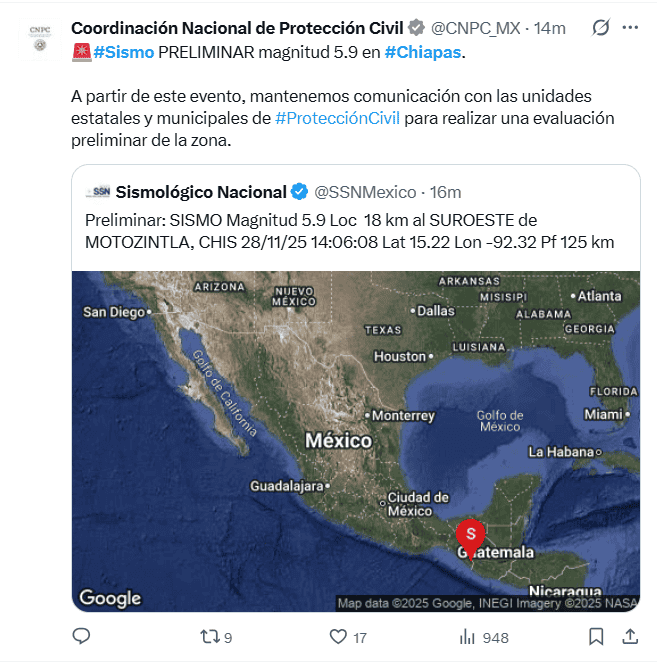Este viernes 28 de noviembre, te compartiremos los datos acerca de los temblores que se presenten en nuestro país, según registros del Servicio Sismológico Nacional (SSN), institución mexicana encargada de monitorear la actividad sísmica en México en tiempo real. El SSN opera una red de estaciones sismológicas distribuidas por todo el país que envían datos de forma continua y en tiempo real a un centro de análisis para determinar la fecha, hora, magnitud, epicentro y profundidad de los sismos.