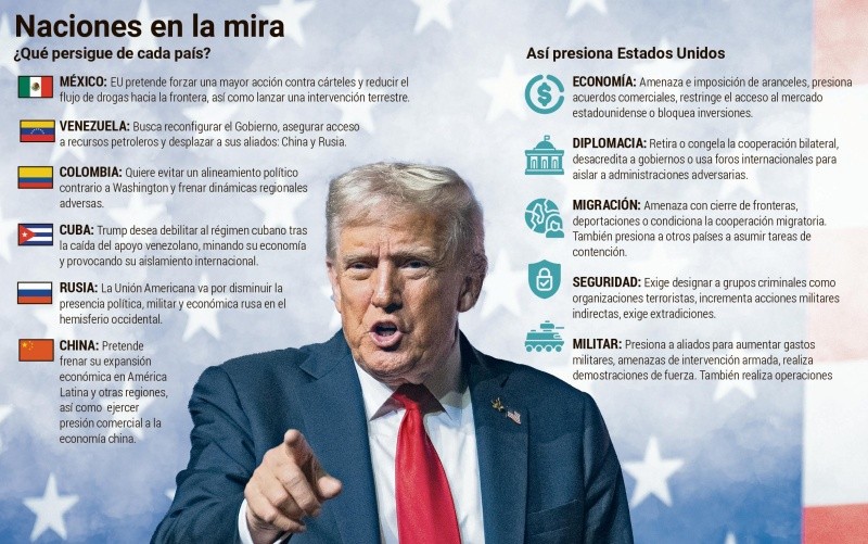 La madrugada del 3 de enero, las Fuerzas Armadas de Estados Unidos irrumpieron en Venezuela y capturaron al mandatario venezolano, Nicolás Maduro. Fue el inicio de una nueva forma de concebir las relaciones internacionales. Luego de varios días, el presidente norteamericano, Donald Trump, lanzó amenazas contra otros países como México, Cuba, Colombia, Groenlandia, Rusia y China.Expertos y analistas ven esta situación como una forma de “reposicionar a Estados Unidos como una potencia dominante en el continente americano”. Y los dichos de Trump podrían dejar entrever otras futuras acciones. En Venezuela, Trump anunció una serie de acciones como la toma de buques petroleros, asumir el control de las ventas de 30 a 50 millones de barriles de petróleo de Venezuela y controlar el Gobierno de forma indefinida en aquella nación. Adelantó que las principales empresas petroleras estadounidenses invertirán cerca de 100 mil millones de dólares para reconstruir a dicho sector del país sudamericano, sin que eso redunde en un beneficio para sus habitantes.Horas después de la captura de Nicolás Maduro, Trump reiteró su postura de que los “carteles manejan México”, en referencia a la presencia de grupos del crimen organizado en nuestro país.El 8 de enero, apuntó que “vamos a empezar ahora a atacar por tierra a los cárteles”, dejando abierta la posibilidad de desplegar tropas estadounidenses en suelo mexicano. El presidente estadounidense ordenó el despliegue de una campaña militar en aguas internacionales del Caribe y el Pacífico oriental que ha consistido principalmente en bombardear embarcaciones a las que acusó de transportar drogas hacia Estados Unidos, con la justificación de que las drogas acaban con la vida de 250 mil ciudadanos norteamericanos cada año. Y con ello, aseguró que ha tenido resultados exitosos: “Detuvimos 97% de las drogas que entraban por el mar”. Y busca justificar un posible ataque en México. No solamente México es objetivo, sino Colombia: Trump vio positiva una posible intervención a Colombia similar a la registrada en Venezuela y cuyo presidente, Gustavo Petro, le fue retirada su visa estadounidense. Y aunque hubo múltiples desacuerdos entre ambos mandatarios, la relación llegó a un punto tranquilo tras sostener comunicación esta semana. Y tras la caída de Venezuela, la presión recae sobre Cuba, aliado clave del país sudamericano, ya que Trump aseguró que el Gobierno de la isla encabezado por Miguel Díaz-Canel “está muy cerca” de caer, pero evitó amenazas directas o alusiones a una posible intervención a aquel país.Por otro lado, Trump ejerce presión económica a Cuba y aseguró que La Habana está perdiendo el respaldo económico de Venezuela tras la captura de Nicolás Maduro y los acuerdos con el gobierno interino de Caracas.Miguel Sigala, académico de la Universidad de Guadalajara, señala que el Gobierno de Donald Trump busca redefinir el lugar de Estados Unidos en el mundo y solucionar problemas relacionados con distintos países. “Lo que está haciendo Donald Trump es afianzar el dominio de Estados Unidos en el continente americano, uno: para reducir la presencia económica y política de China y de Rusia. La presencia de las dos grandes potencias habían encontrado a socios comerciales muy importantes”, dijo. China y Rusia han recibido críticas de funcionarios norteamericanos como Marco Rubio, secretario de Estado o Mike Waltz, enviado estadounidense ante las Naciones Unidas, quienes cuestionaron su incursión en el hemisferio occidental, particularmente de China. El comercio del país asiático ha crecido en países latinoamericanos, obligando a Estados Unidos a ejercer presión para reducir el comercio con China. Ambos países preocupan a Trump por otro territorio en disputa: Groenlandia. Trump declaró que Estados Unidos hará algo en Groenlandia porque de lo contrario, Rusia o China se apoderarán del territorio y no los quiere de vecinos. Ha planteado el uso económico o militar.Las declaraciones encendieron las alarmas en Dinamarca y la Unión Europea, quienes cerraron filas con los daneses mientras que estos últimos rechazan cualquier intervención estadounidense.Los conflictos recientes en el planeta, el último de ellos la intervención de Estados Unidos a Venezuela, evidencian que no hay alguna instancia u organismo internacional que evite dichos pleitos entre naciones y no pueden frenar las acciones que implemente Donald Trump, presidente de la Unión Americana.El académico de la Universidad de Guadalajara, Miguel Sigala, consideró que la ONU (Organización de las Naciones Unidas) está “herida de muerte”. Acusa que son los líderes de los países con carácter populista quienes critican constantemente las decisiones de las Naciones Unidas o las ignoran.“La política de las grandes potencias tiene herida de muerte a las Naciones Unidas. Otros líderes populistas se caracterizan por el rechazo y el desprecio a las instituciones internacionales”.Ejemplo de ellos es que el presidente de Estados Unidos, Donald Trump, ha retirado a ese país a 66 organizaciones internacionales, incluidas algunas que trabajan para combatir el cambio climático.De ellas, 31 son de las Naciones Unidas, algunas de las afectadas son la Convención Marco de las Naciones Unidas sobre el Cambio Climático, un tratado que sustenta todos los esfuerzos internacionales para combatir el calentamiento global o el Panel Intergubernamental sobre el Cambio Climático (IPCC), la principal autoridad mundial en ciencia climática.La Casa Blanca acusó que la decisión se debe a que dichas entidades “ya no sirven a los intereses estadounidenses” y promueven agendas ineficaces u hostiles.Por otro lado, el académico Arturo Santa Cruz Díaz Santana señaló que solamente China podría hacerle frente. Por lo que consideró que solamente sus ciudadanos pueden evitar más decisiones contraproducentes impulsadas por el pres